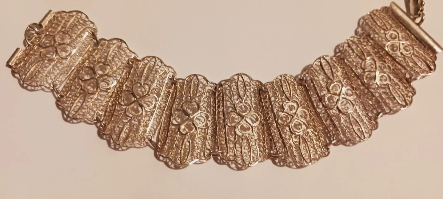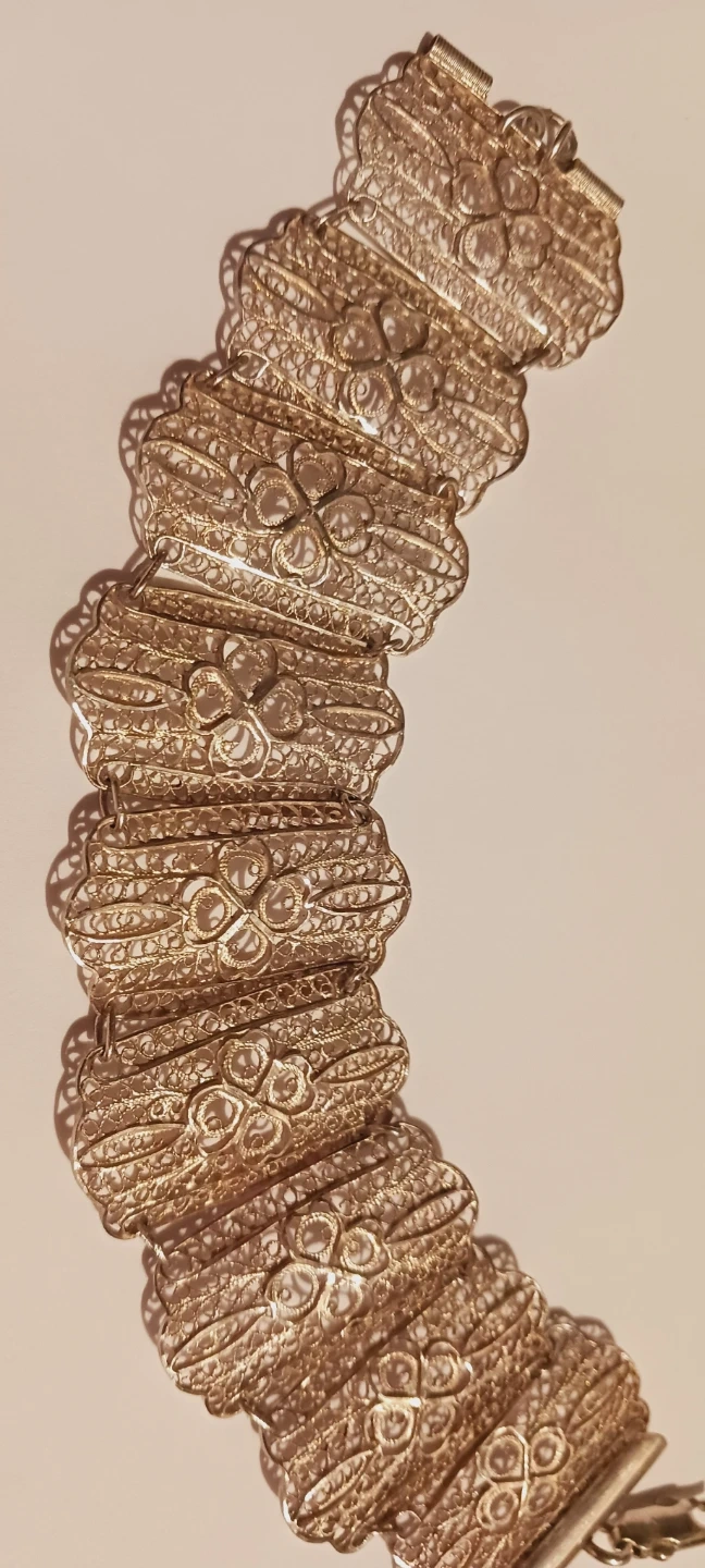 Sterling Silver 925 stamped beautiful wide bracelet with intricate filigree work. Each section features a floral design with delicate swirling patterns. It's designed with a secure clasp for easy wear. This piece adds an elegant touch to any outfit!!! 7.5" long. Excellent condition. ALL MY PRICES ARE NEGOTIABLE !!