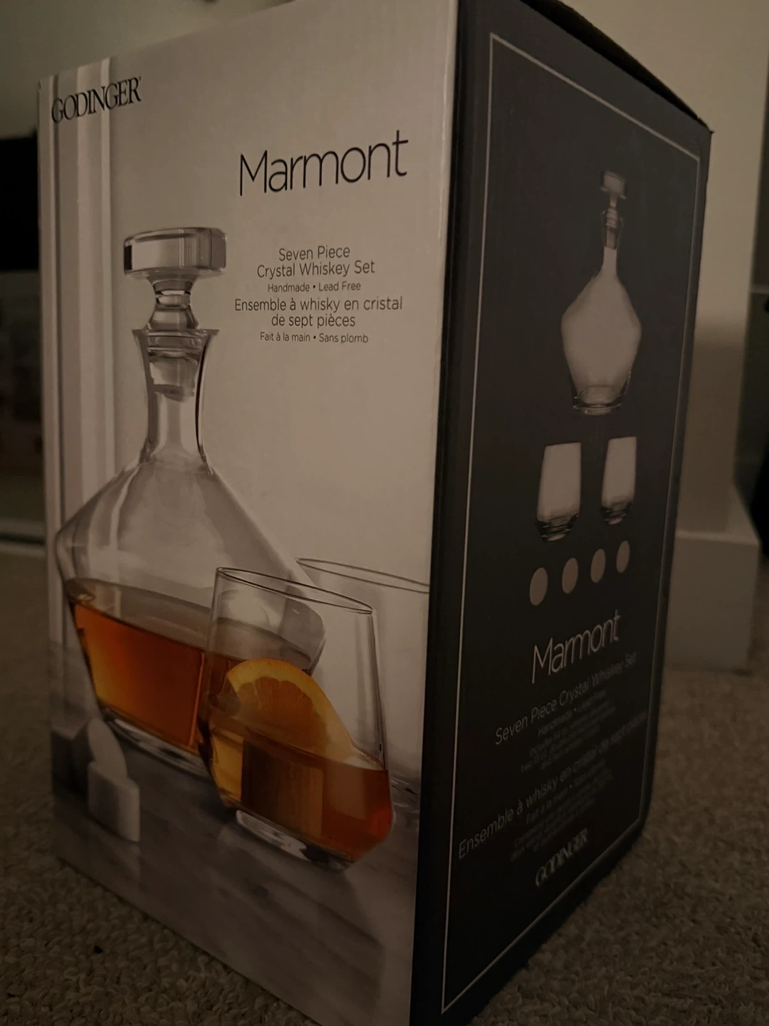 This is a Godinger Marmont Seven Piece Crystal Whiskey Set. It's handmade and lead-free. Includes a 54 oz. whiskey decanter, two double old-fashioned glasses, and four whiskey stones.