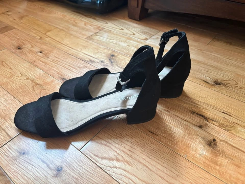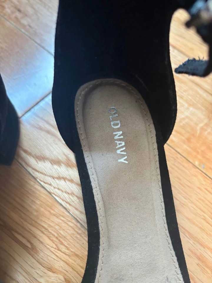 Ladies open toe sandals..size 8..black suede..in excellent condition..from Old Navy..approx. 1” heel ..10 dollars.