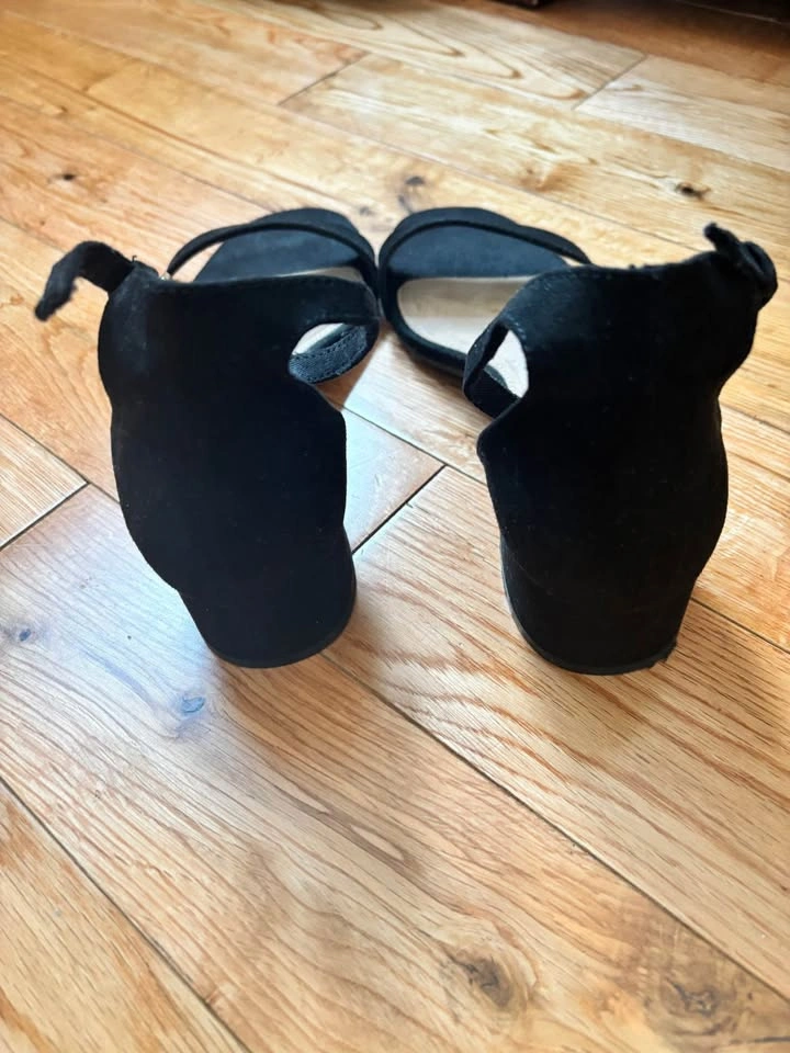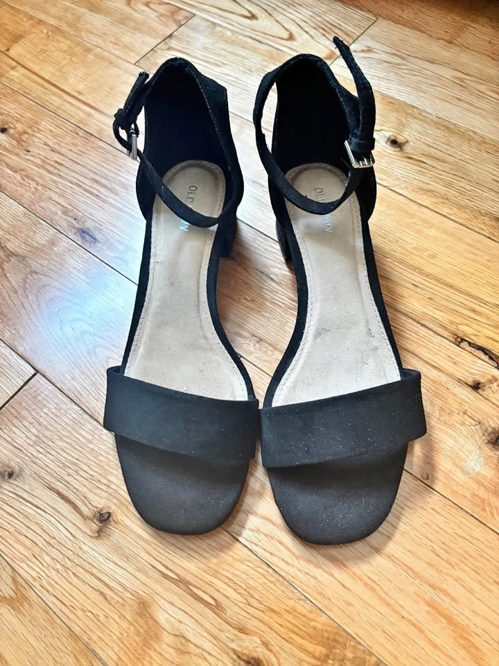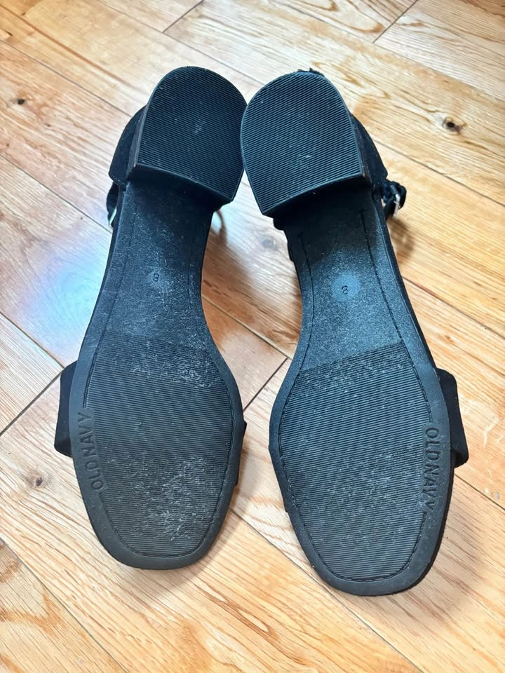 Ladies open toe sandals..size 8..black suede..in excellent condition..from Old Navy..approx. 1” heel ..10 dollars.