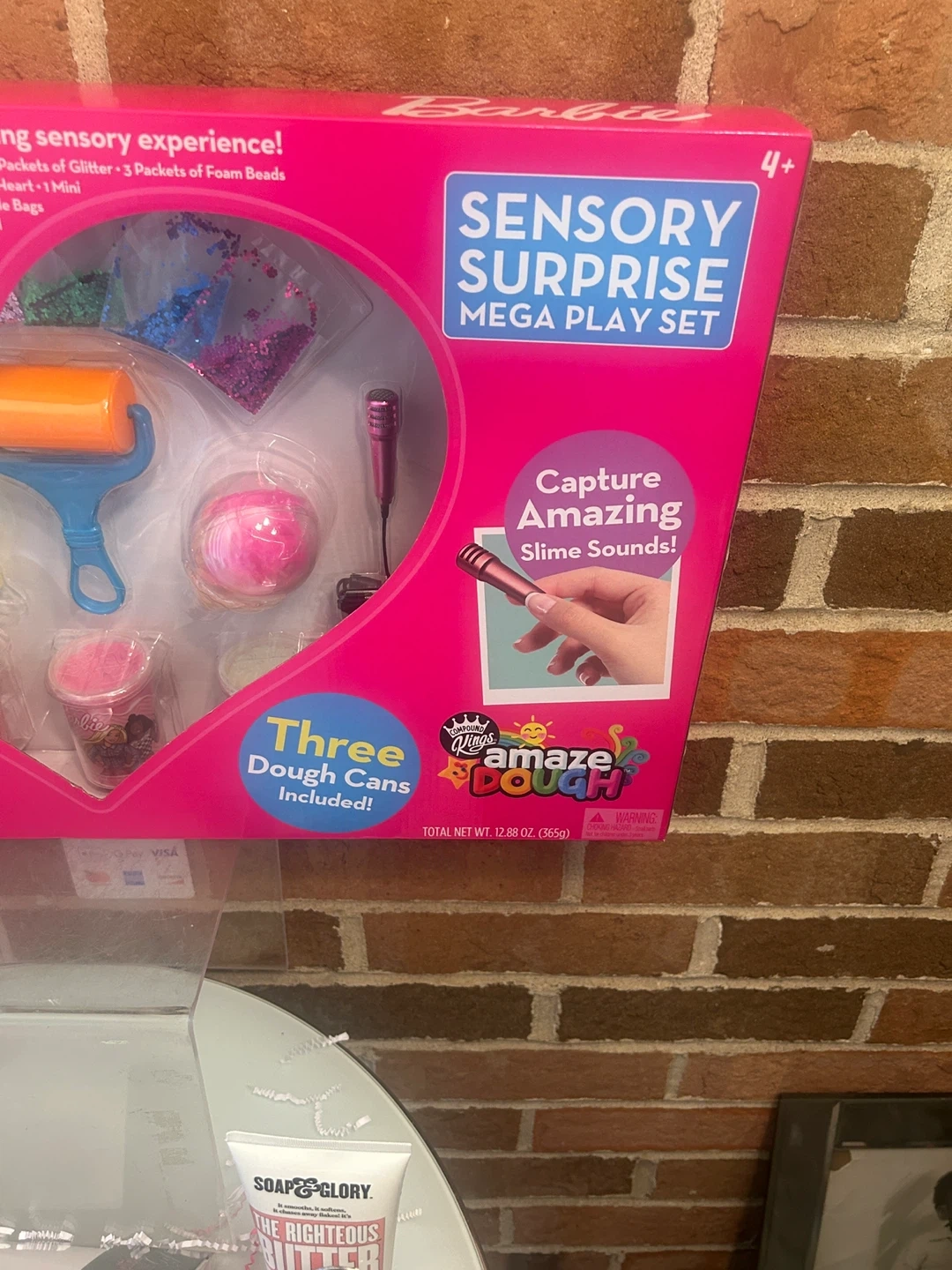 Create an amazing sensory experience with this Barbie Mega Play Set. It includes 3 tubs of dough, 2 ice cream cone containers, 5 packets of glitter, 3 packets of foam beads, 1 packet of sprinkles, felt hearts, a microphone, 2 bubble bags, a roller, and a brush. Great for imaginative play and sensory exploration!