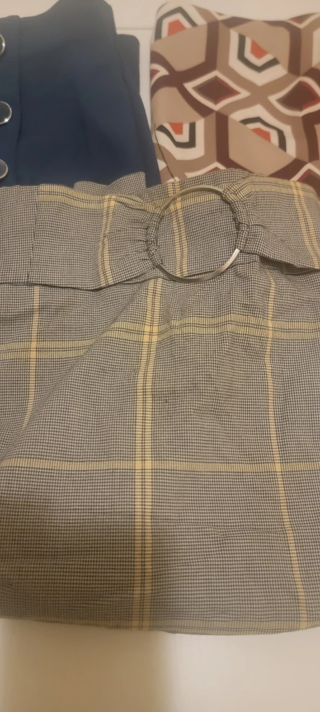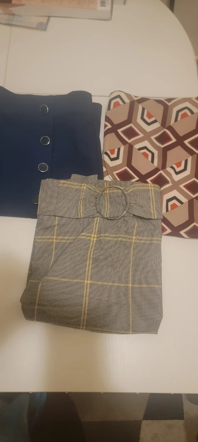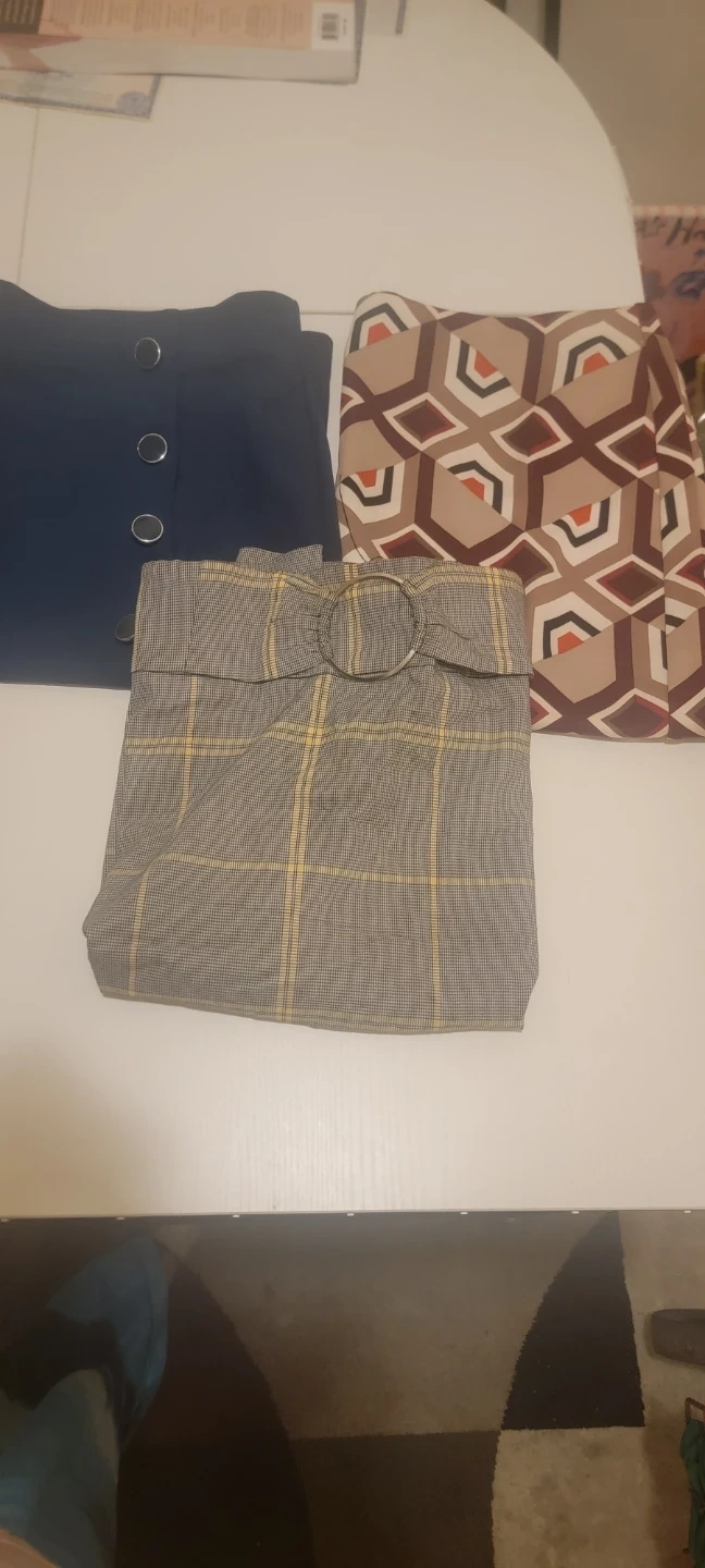This 3-package deal is a multi-plaid skirt, a plaid skirt, and a unique buckle detail at the waist turquoise skirt. It's a stylish piece for any wardrobe. The material is a polyester blend. Different women sizes (Medium to Large). Pair it with a blouse or sweater for a complete look!