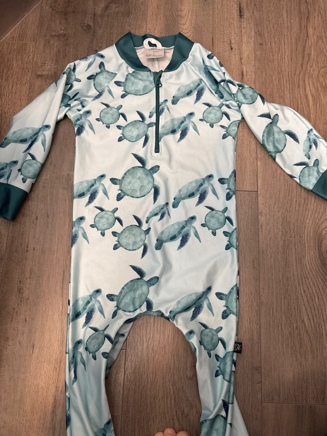 toddler 2t long-sleeve rash guard swimsuit with a cute turtle print. It has a zipper closure at the neck for easy dressing. Soft and stretchy material.