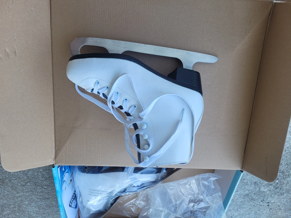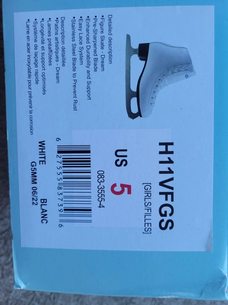 These Dream figure skates are in great shape and ready for the ice! They're a girls size 5 and come in their original box. Features include a pre-sharpened blade, enhanced durability and support, and an easy lace system. The stainless steel blade helps to prevent rust, so they'll last a long time