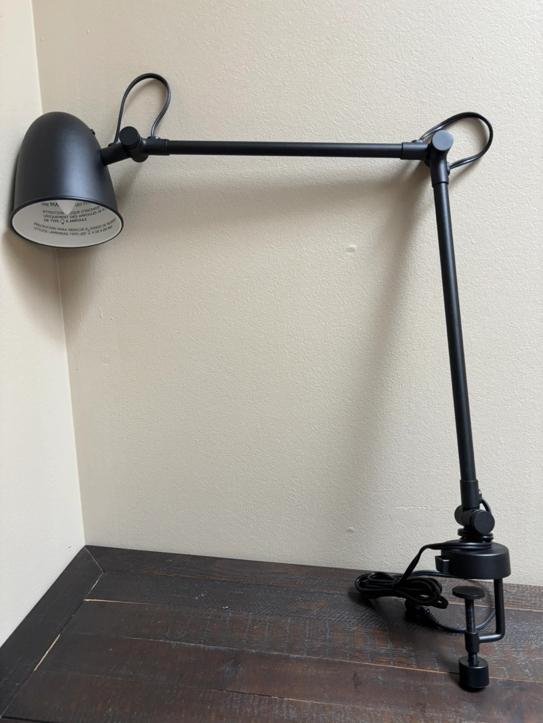 Black adjustable desk lamp with a clamp base. This lamp uses a single bulb and has an articulated arm for positioning.
