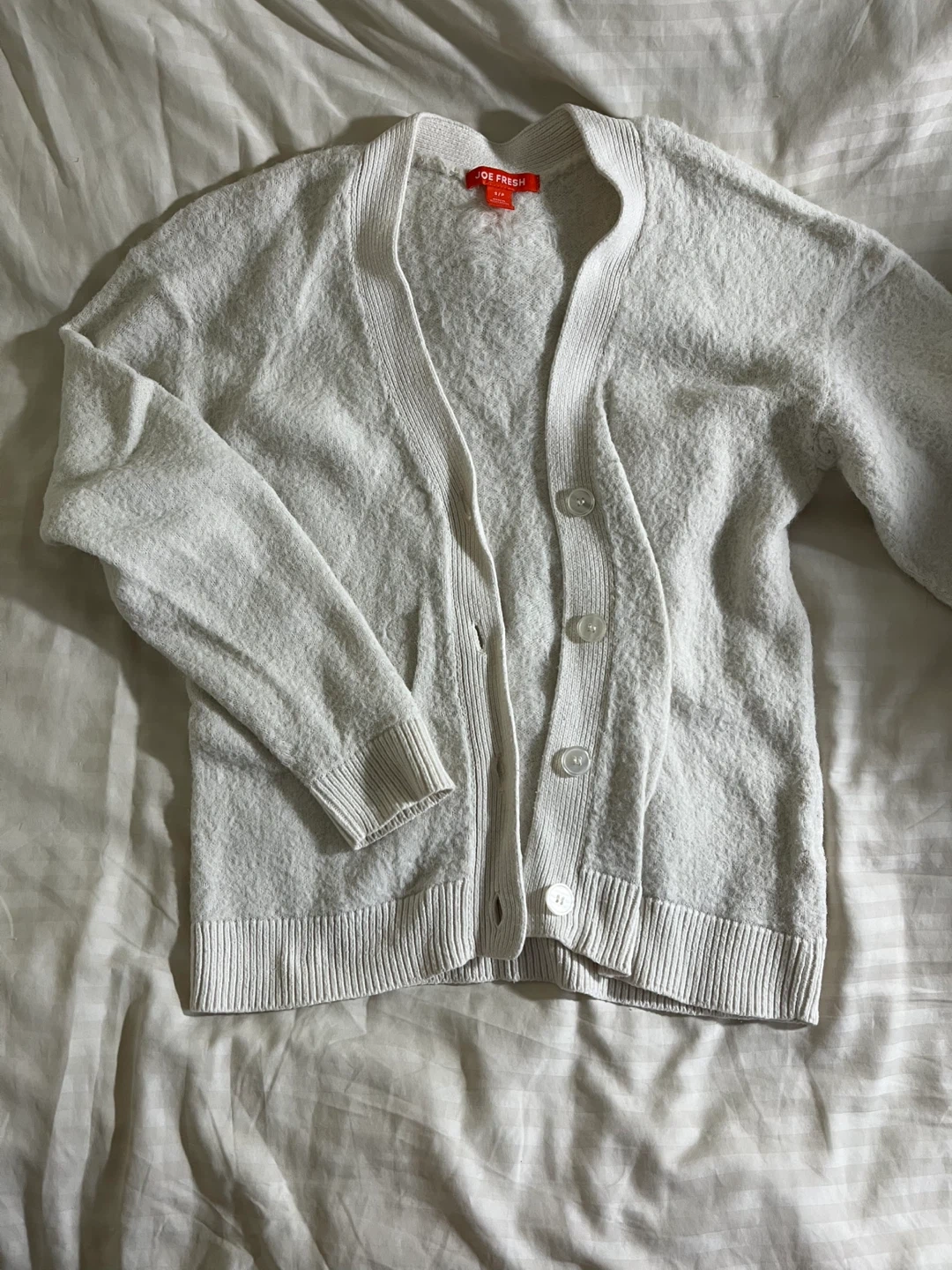 Cozy Joe Fresh cardigan in a soft white colour! It's made with 60% cotton and 40% acrylic, making it comfy for layering. The size is S/P.