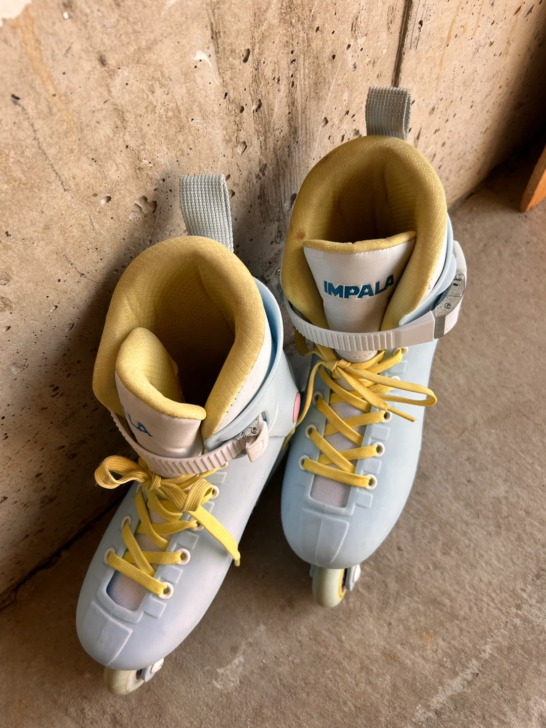 Impala inline skates in a light blue colour. Yellow laces and accents. Size 6 US Women's. Perfect for cruising around town! Snug fit.
