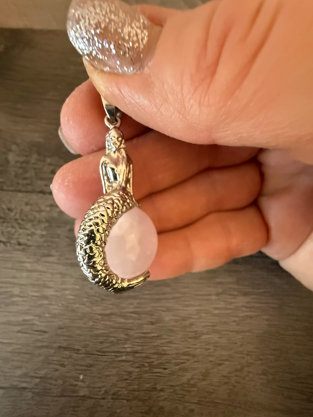 Rose Quartz pendant with a silver-tone mermaid design. Originates from Brazil and Madagascar. Rose Quartz stimulates unconditional love and promotes peacefulness in relationships. It's a great stone for family,friendships and self love! π