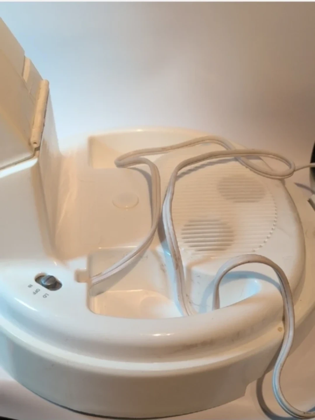 Salon Style Dryer powerful 1875 watts to gently dry and style your hair. Fully adjustable large hood, with two height and heat settings and it comes with 6-foot-long cord that stores in the base. The large hood 8s designed to accommodate jumbo curlers. Bonnet styler innovated to bring salon styling to the comfort of your home. It is designed with carry handle for ease of storage and the handle swivels to allow air flow in and out when fan is on. Please note that there is some color staining, this does not affect usability or product functionality.