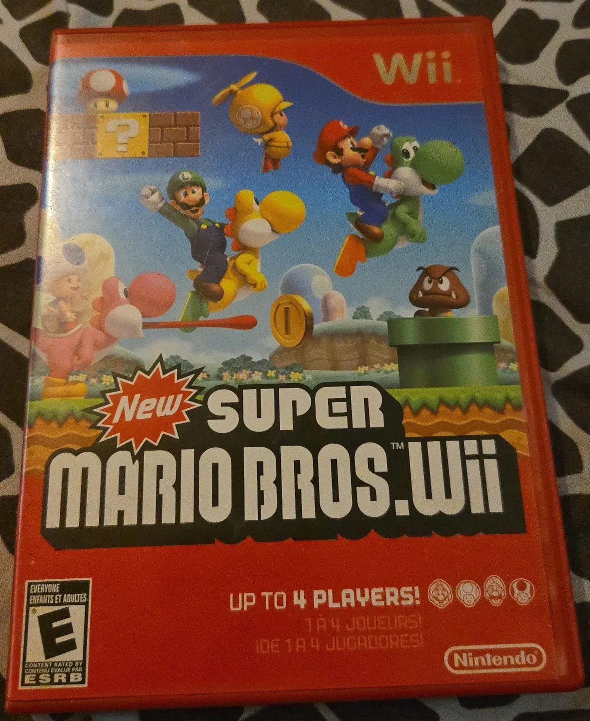 It's the New Super Mario Bros. Wii game for the Nintendo Wii console. Up to 4 players can join in on the fun! This game is rated E for Everyone by ESRB.