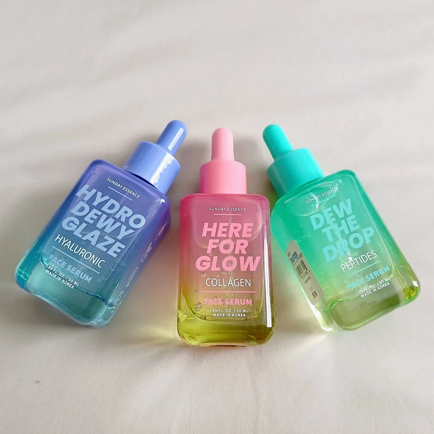 Set of three Sunday Essence face serums. Includes Hydro Dewy Glaze (Hyaluronic), Here For Glow (Collagen), and Dew The Drop (Peptides). Each serum is 1.69 fl oz / 50 ml.