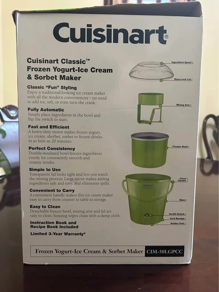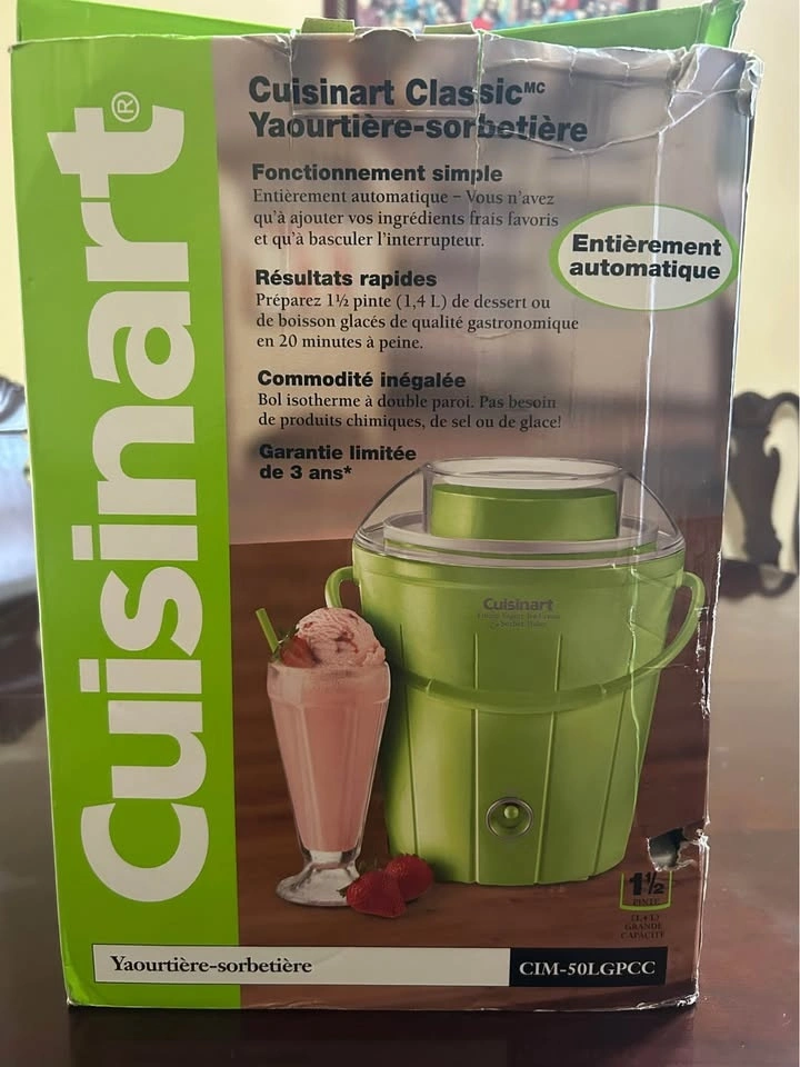 Brand new Cuisinart Classic Frozen Yogurt, Ice Cream & Sorbet Maker. Never used. The box is slightly damaged, but the machine itself is brand new and untouched. Fully automatic, fast results, and large 1.5-quart capacity. Great for homemade ice cream, sorbet, or frozen yogurt.