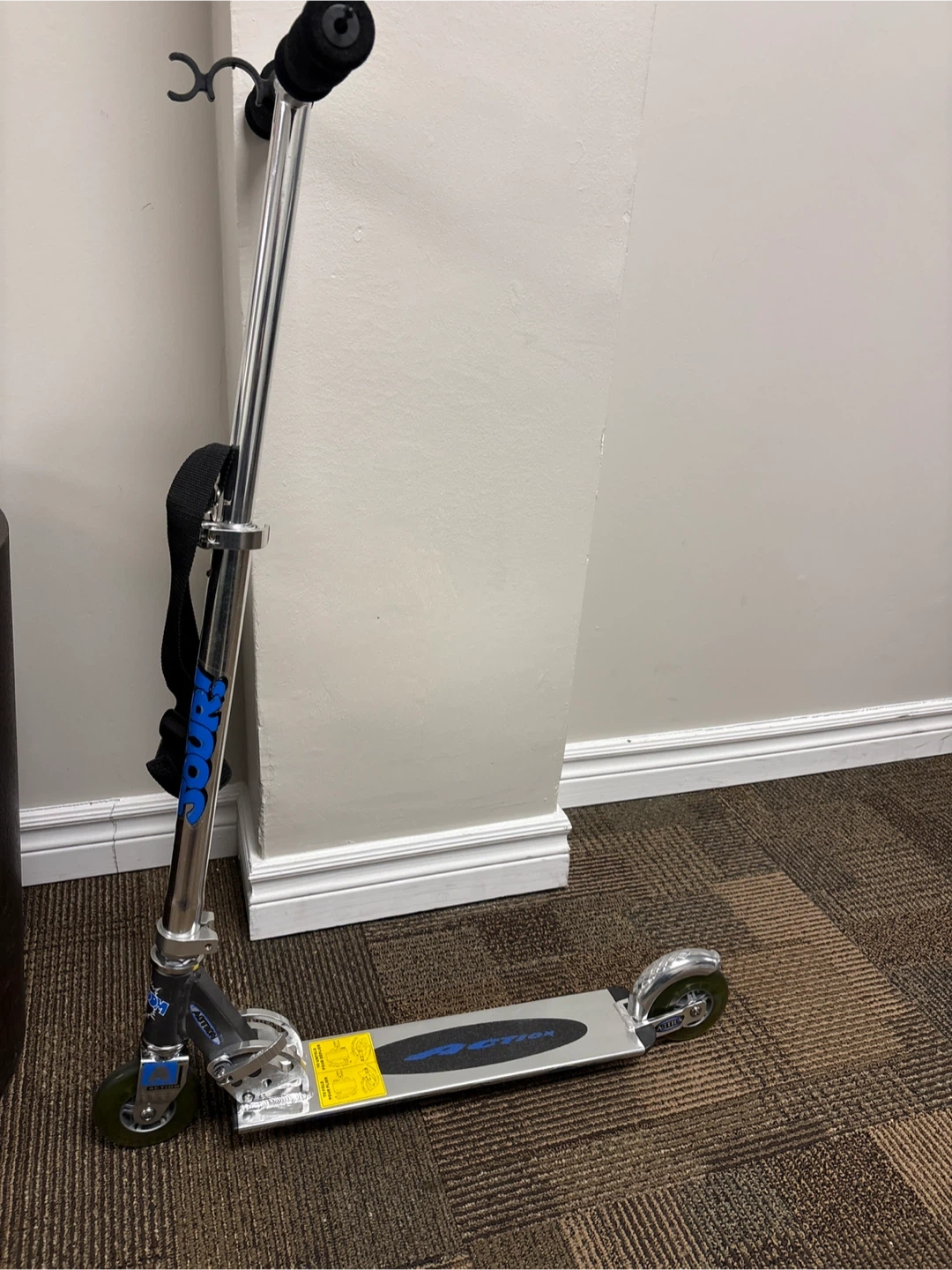 It's a folding scooter by Action. Features a metal frame and handlebar. Great for getting around! This scooter features a lightweight frame and easy folding mechanism for convenient storage and transport brand new in the box ( instructions included)