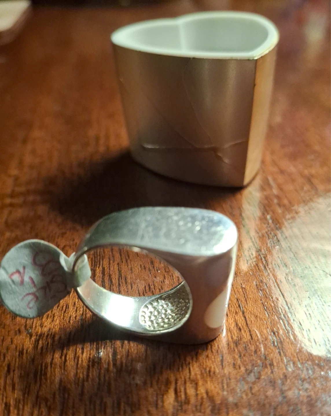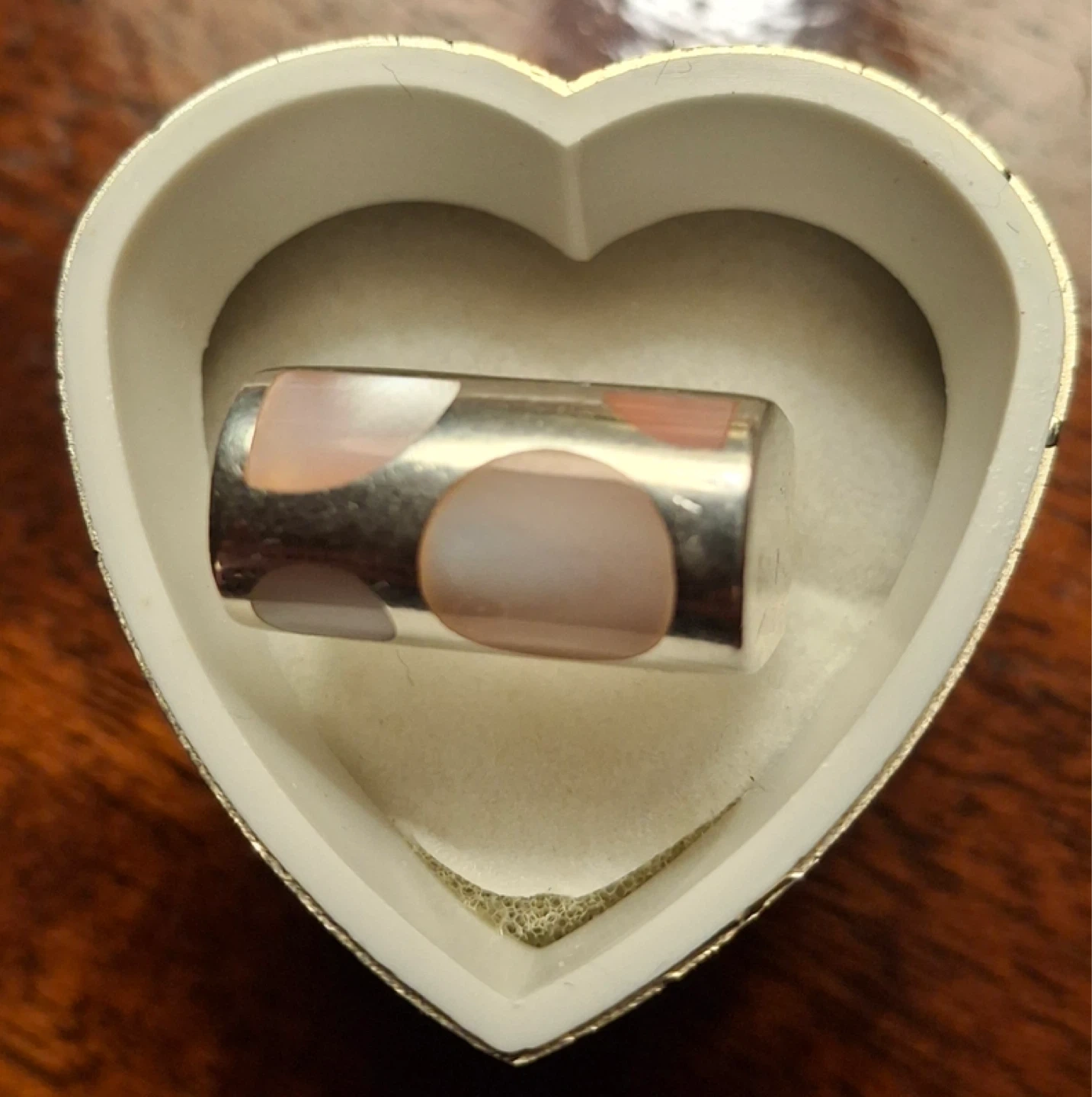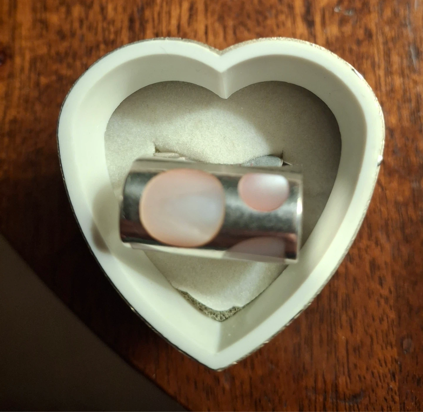 Unique ring with pale pink circle detail (silver stamped 925). Solid sides. Size 8.5. New/never been worn.
