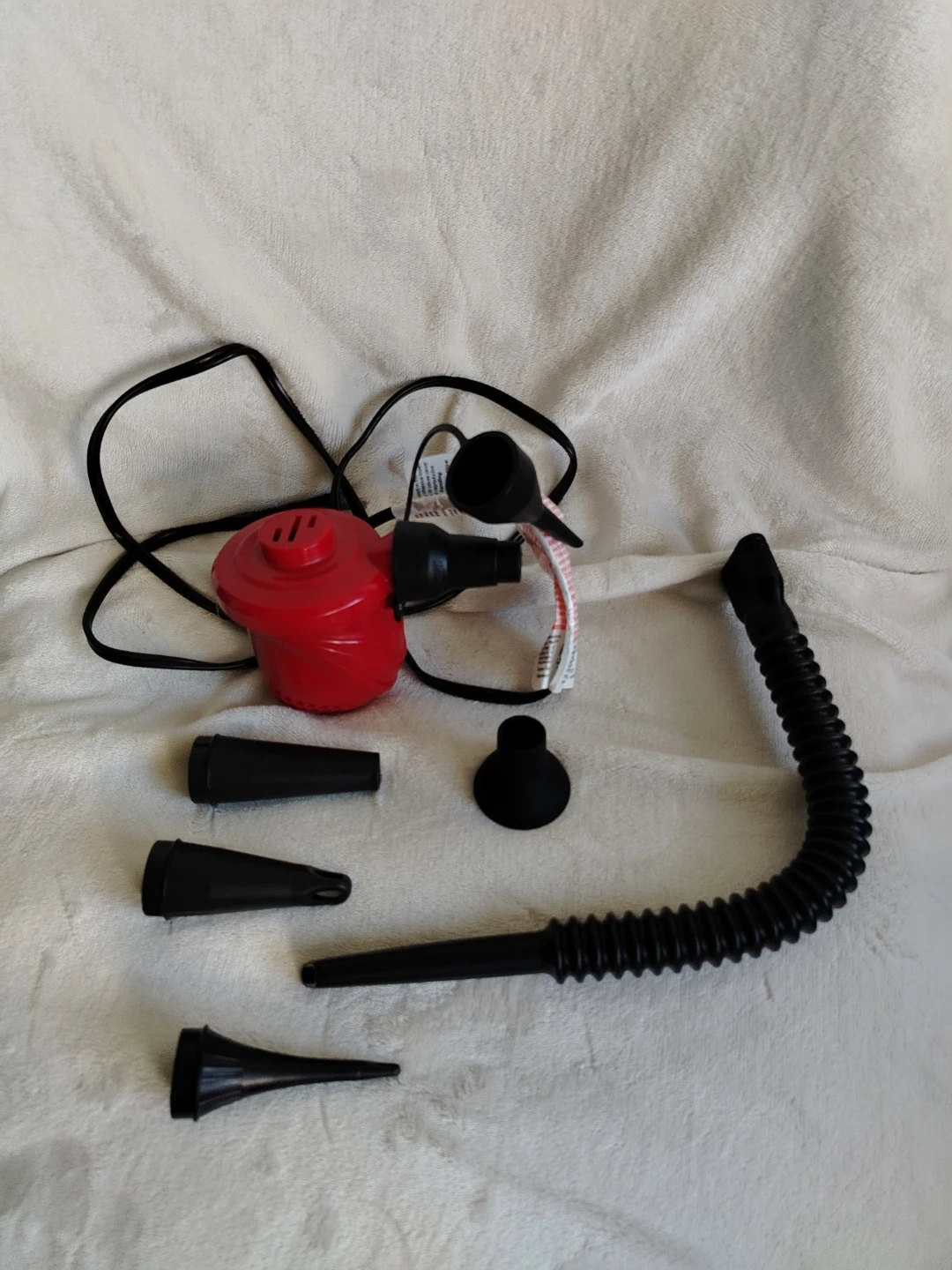 This is a red electric air pump. It comes with a main unit and a flexible hose. Several black nozzles of different sizes are included for balls, wheels, ballons, mattresses, etc. .