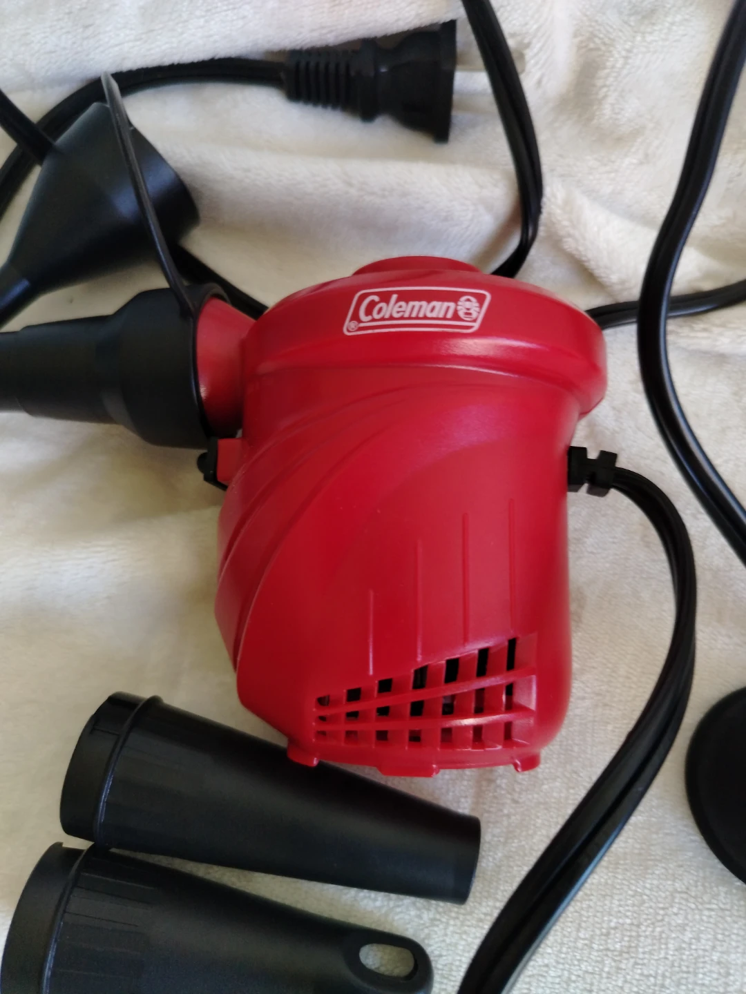 This is a red electric air pump. It comes with a main unit and a flexible hose. Several black nozzles of different sizes are included for balls, wheels, ballons, mattresses, etc. .