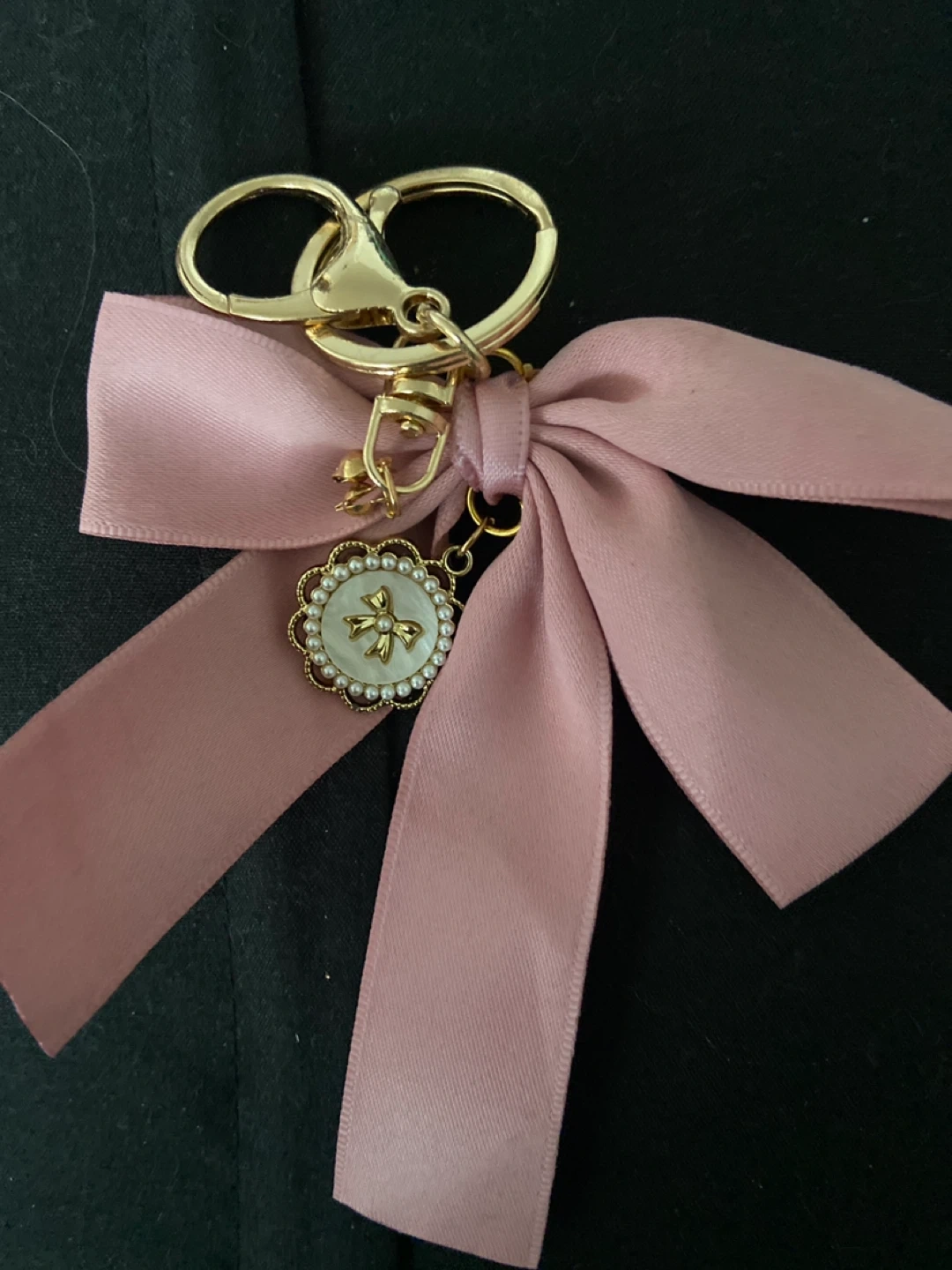 A cute pink ribbon bow keychain with a decorative charm. The charm is round with a pearl border and a gold bow design in the centre. It's attached to a gold-tone keyring and clasp. This accessory adds a touch of flair to bags or keys!