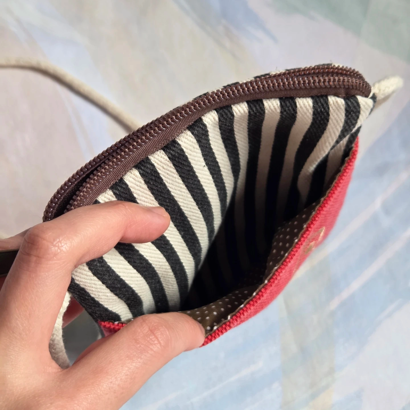 Features 2 storage compartments for small items and the material is soft canvas (not water resistant)