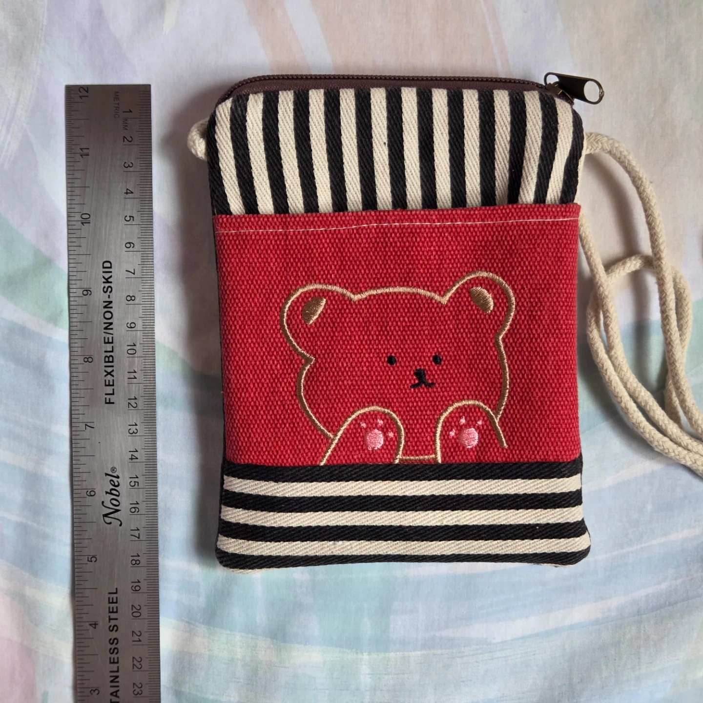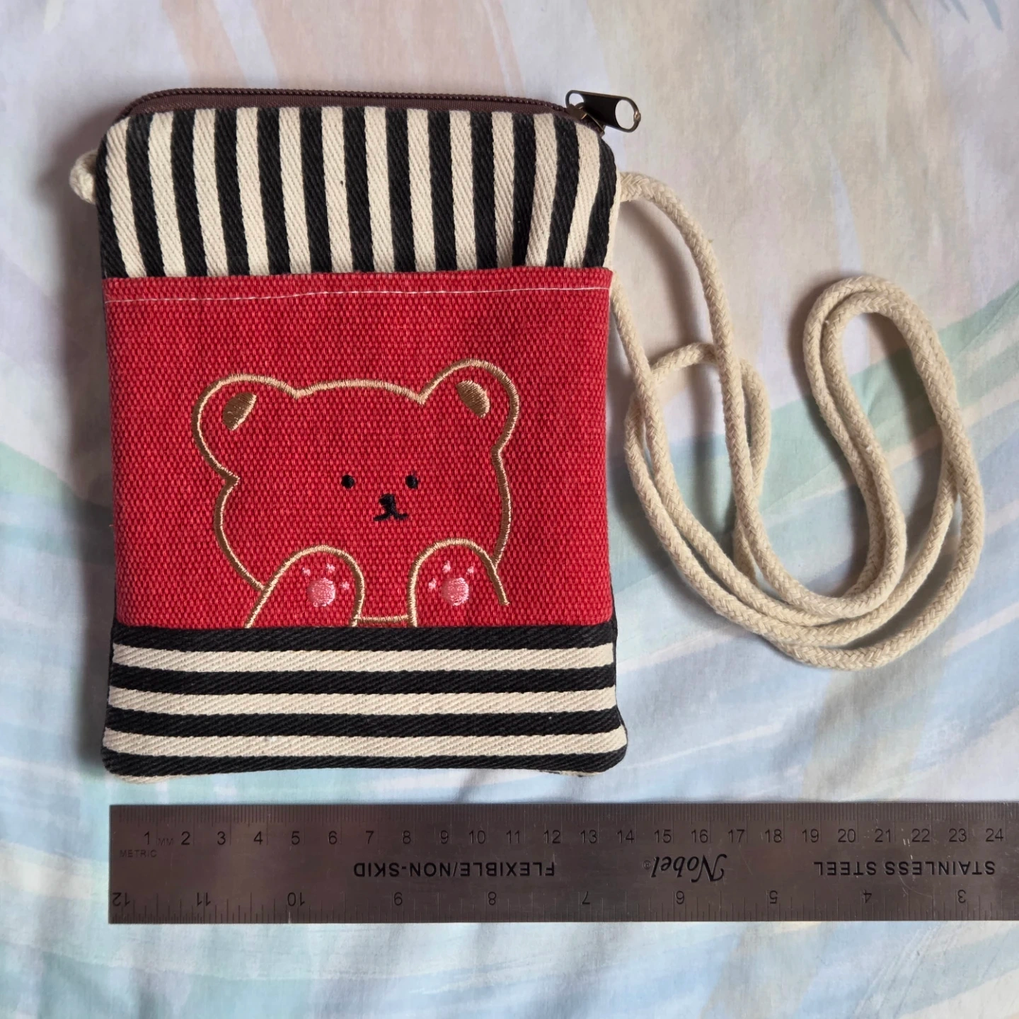 Selling a cute, small crossbody bag with a bear embroidered on the front
