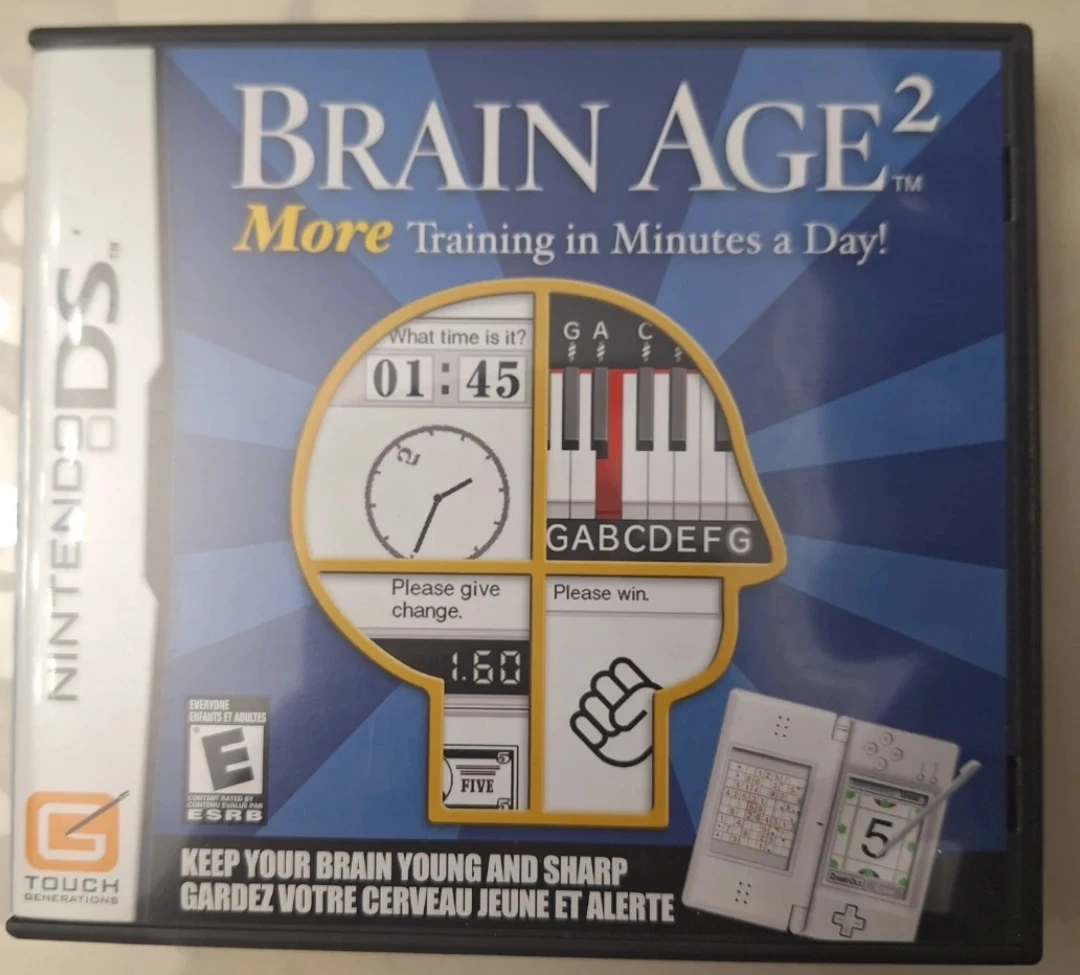 This Nintendo DS game, Brain Age 2, offers more training in minutes a day. It features a variety of puzzles and exercises to challenge your mind. This includes over 100 new Sudoku puzzles and activities to improve your concentration and lower your brain age score. It's designed for quick mental workouts whenever you have a few spare minutes!