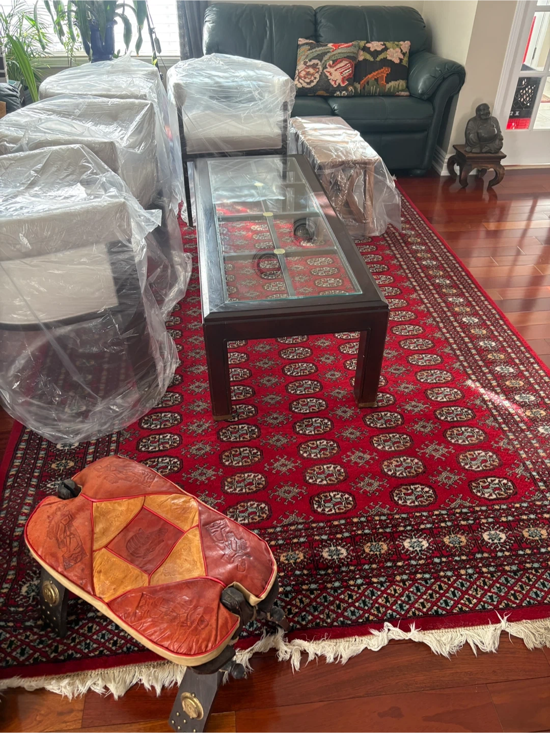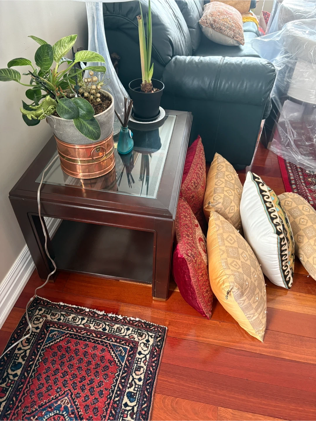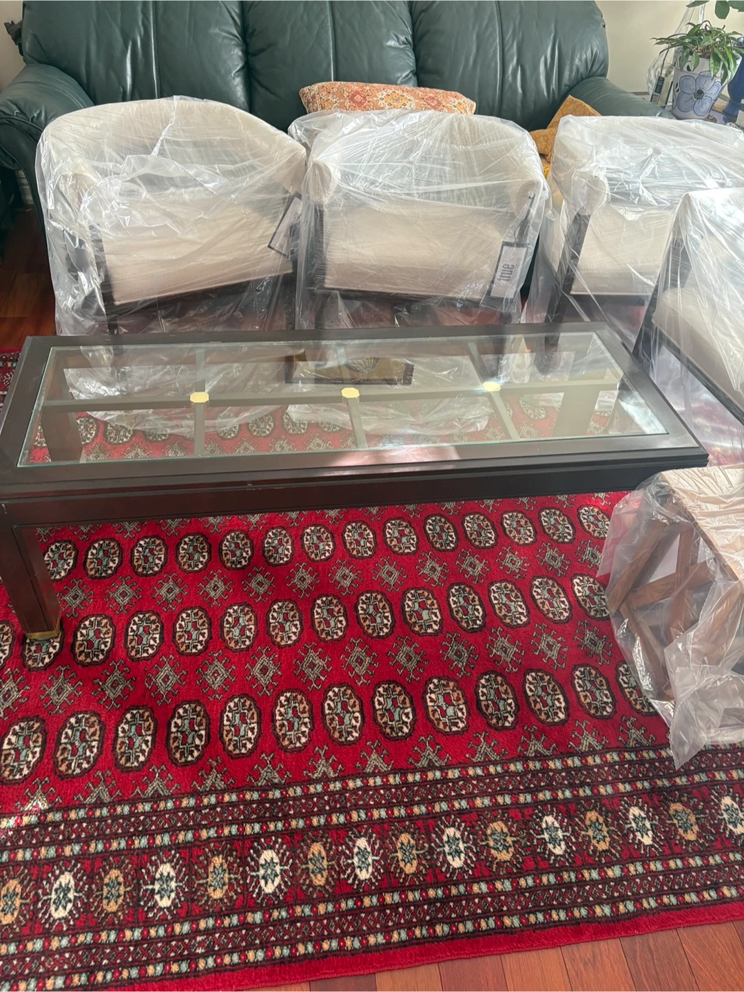 A handsome dark wood coffee table featuring a clear glass top. It's perfect for adding a touch of elegance to your living room. The table provides ample surface space for drinks or decor. Pick up in Whitby