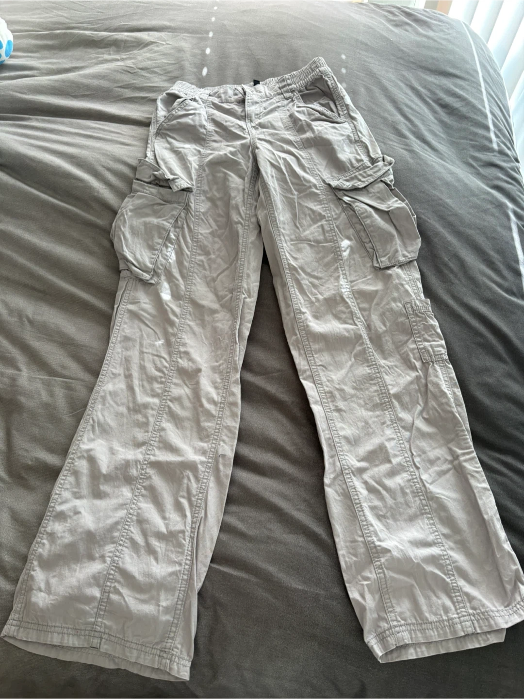 These grey cargo pants are made from 100% cotton. They feature an elastic waistband with a drawstring for a comfortable fit. Multiple pockets for convenience.