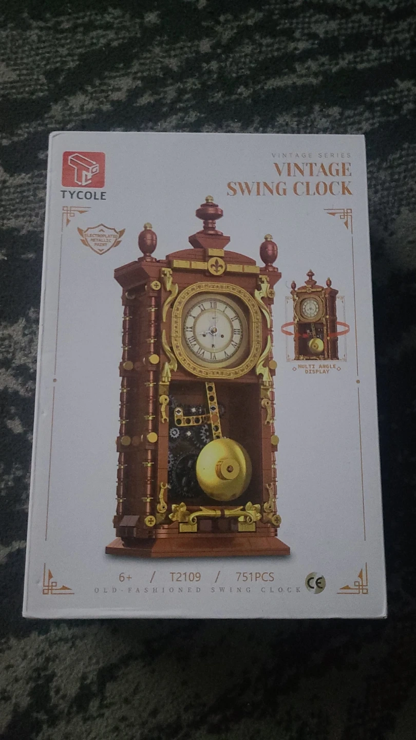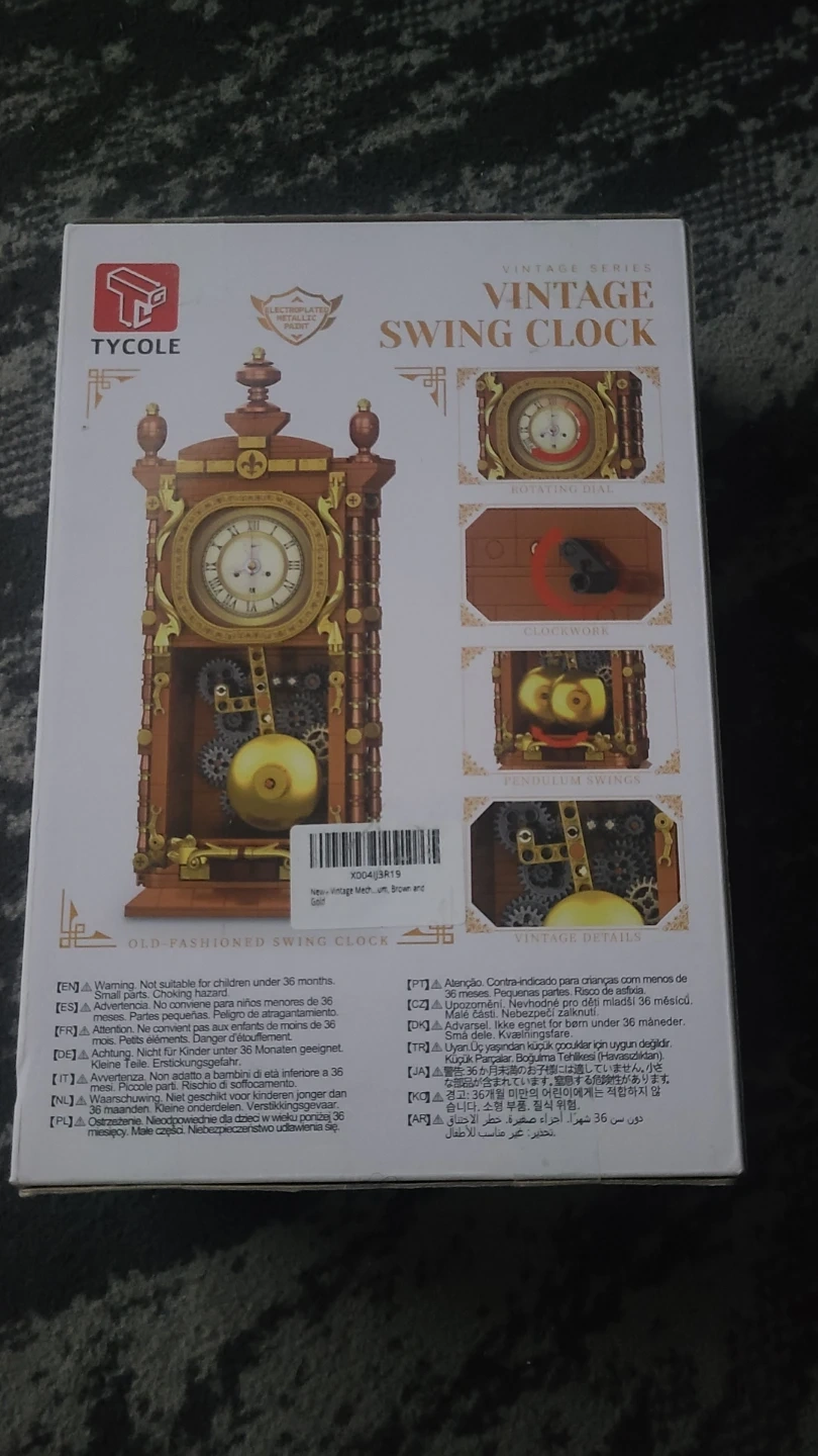 This is a working tycole vintage series swing clock kit includes 751 pieces. It's an old-fashioned clock with a multi-angle display. Suitable for ages 6 and up, it offers a rotating dial and pendulum swing detail it also doesn't come with batteries.