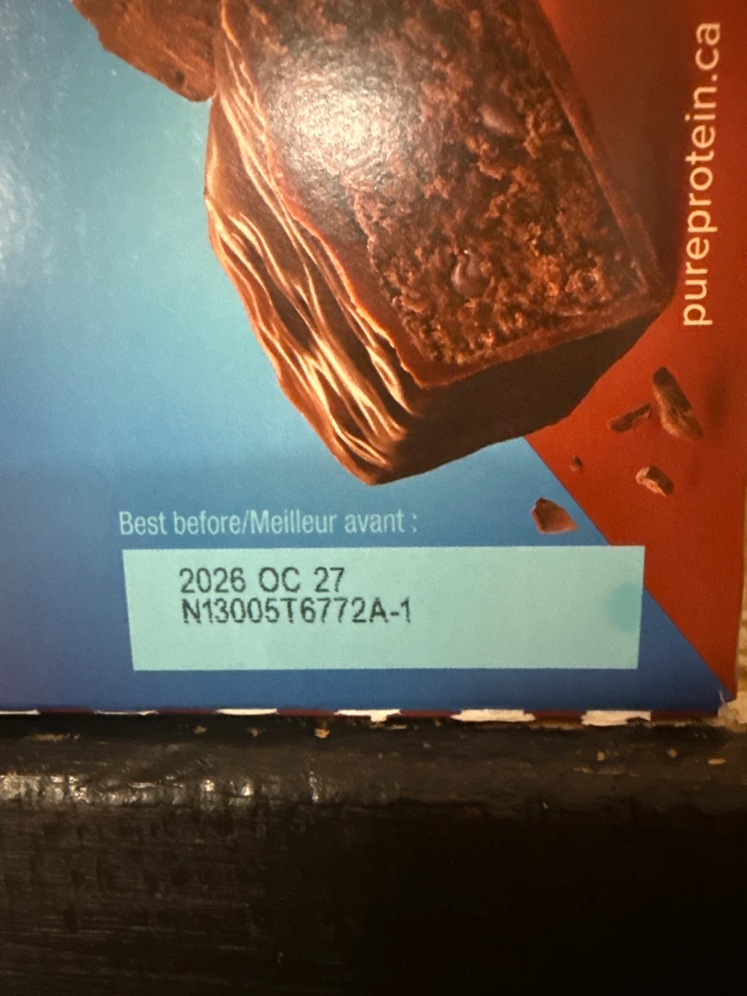 Unopened box of 12 Pure Protein Chocolate Deluxe bars. These gluten-free bars contain 21g of protein and 180 calories per bar. Best before October 27, 2026.