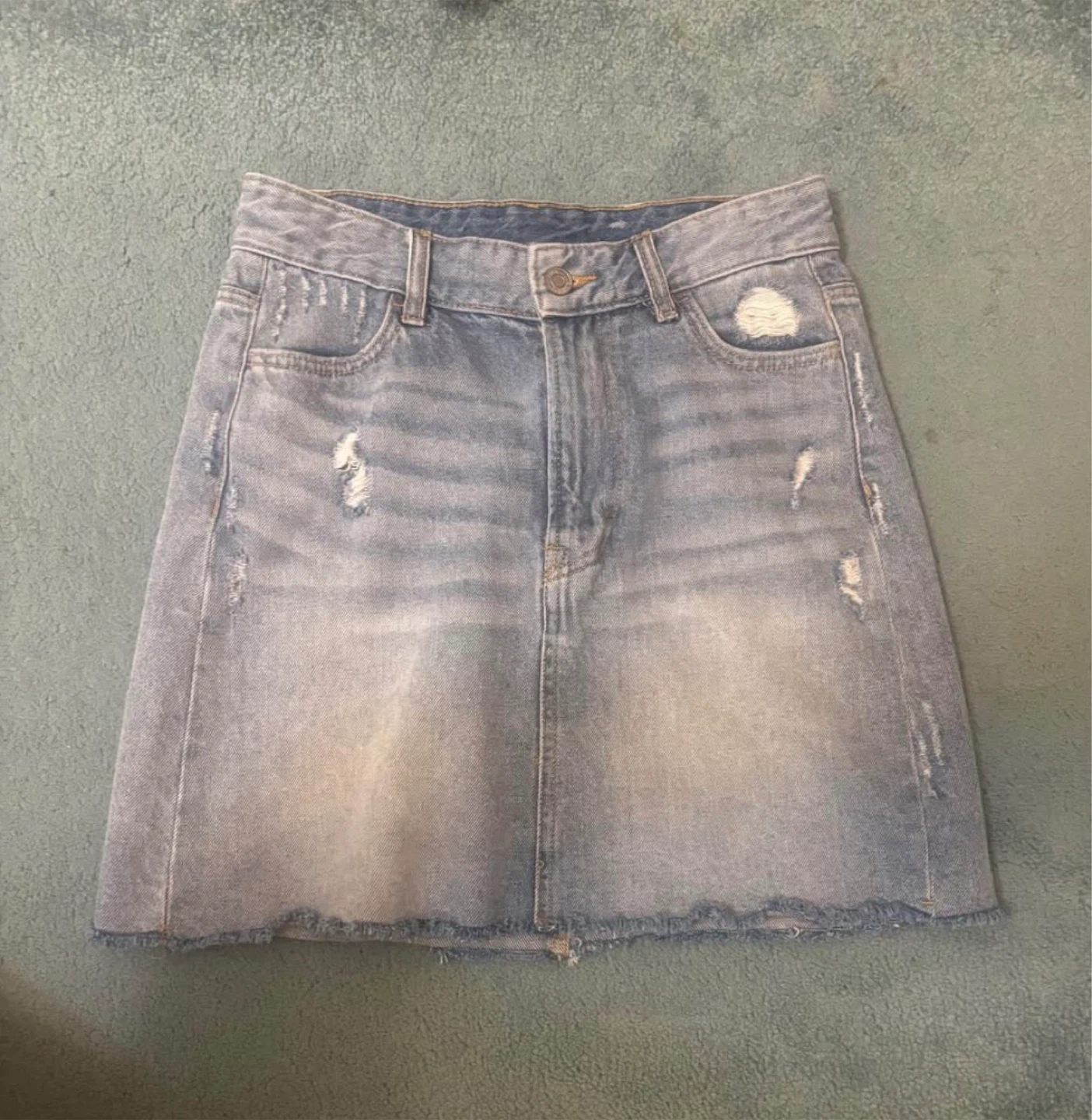 This is an H&M denim skirt. It's a light blue wash with distressed detailing. Size is US 2 in perfect condition!