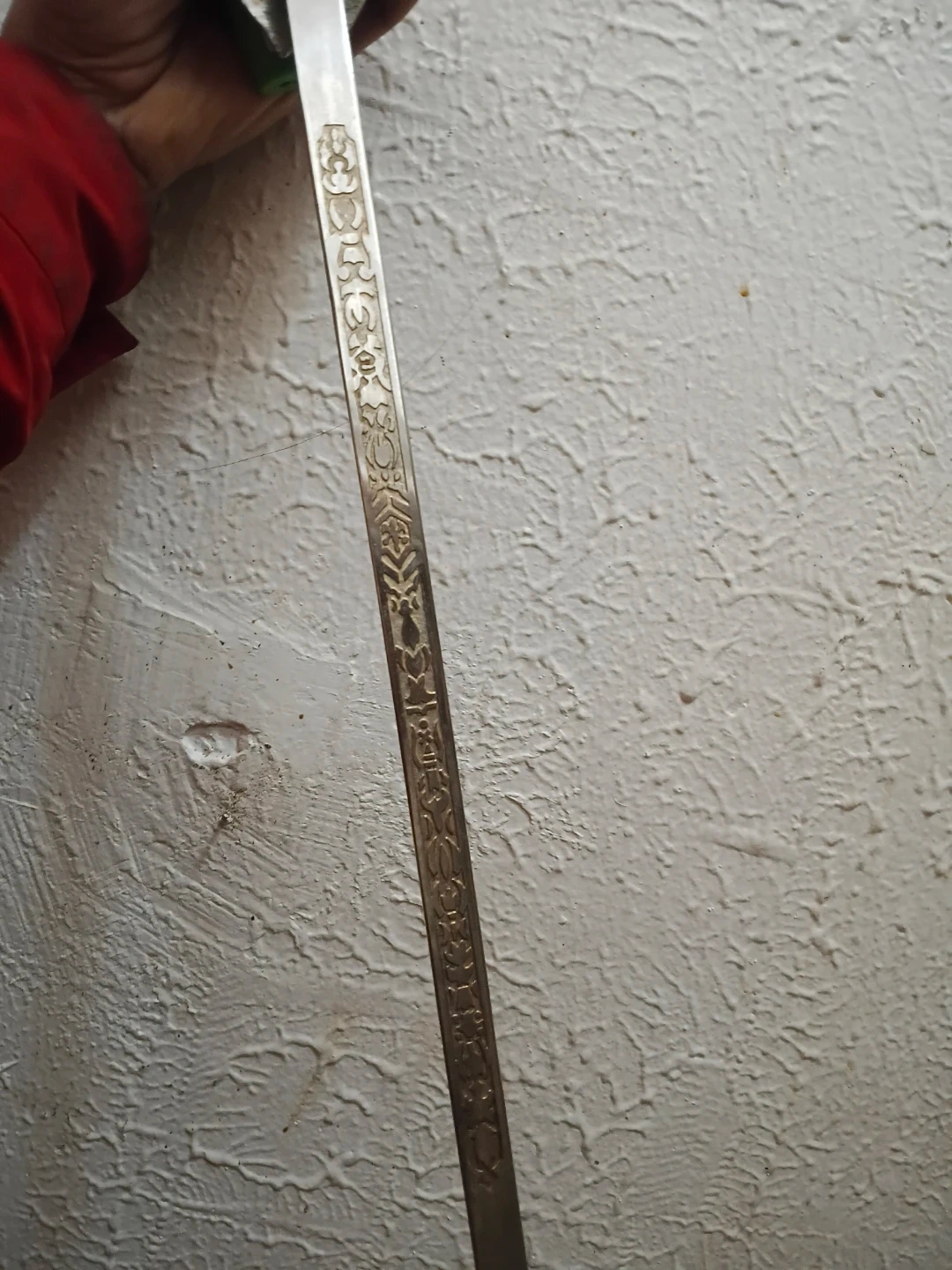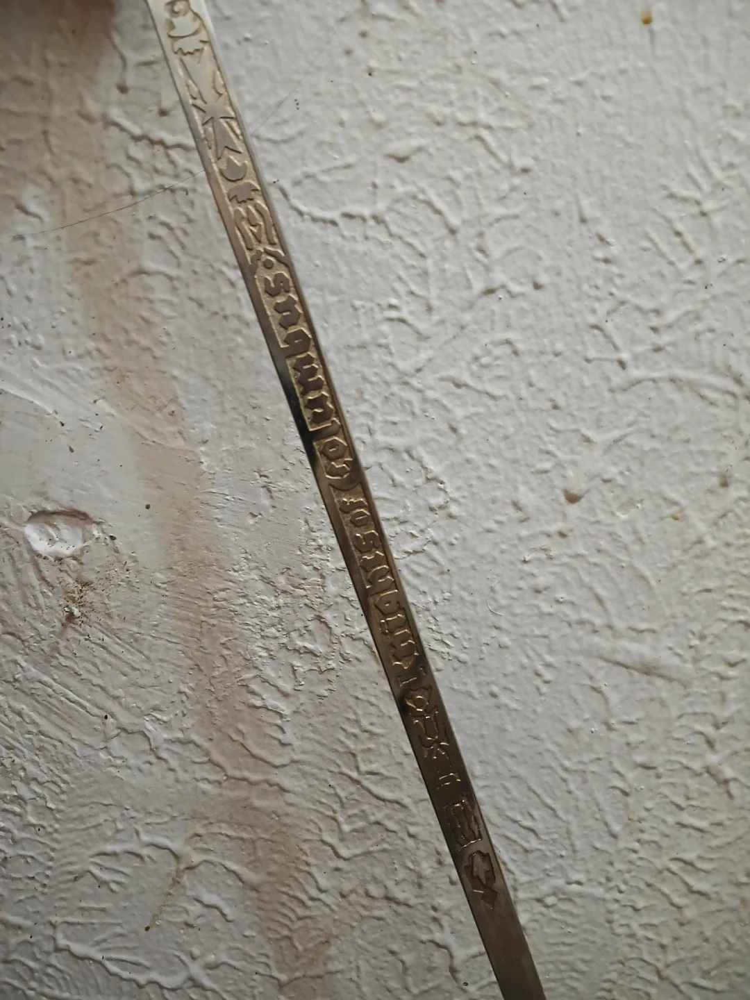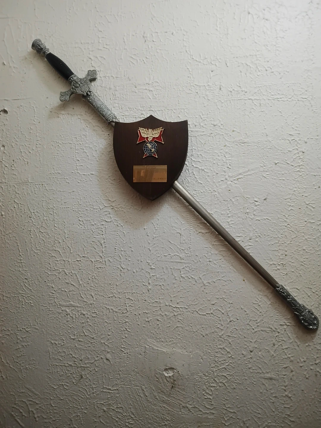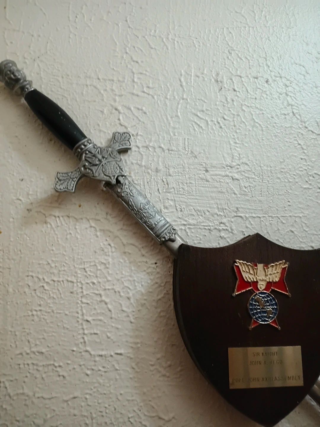 Decorative sword with an ornate handle and engraved blade. It comes mounted on a shield-shaped plaque. The plaque includes an emblem and a plate that reads 'SIR KNIGHT JOHN A. REGO POPE JOHN XXIII ASSEMBLY'.