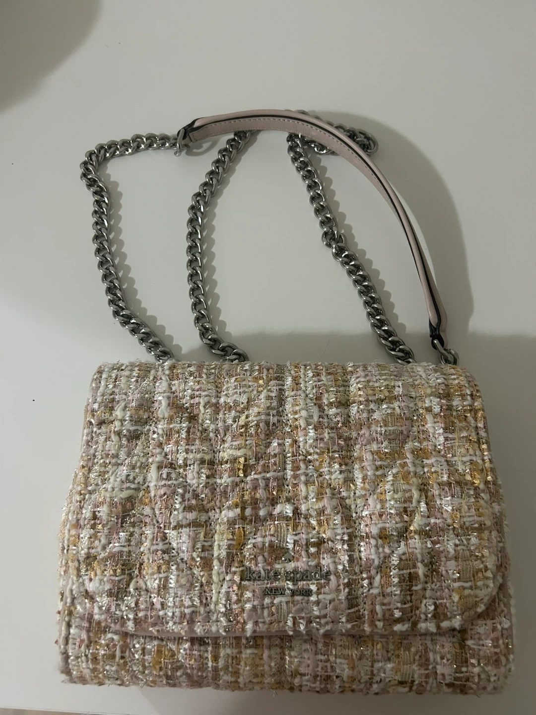 This is a stylish Kate Spade shoulder bag made with a textured tweed fabric. It features a classic flap closure and a silver chain strap. Its neutral colours make it a versatile accessory for many outfits.