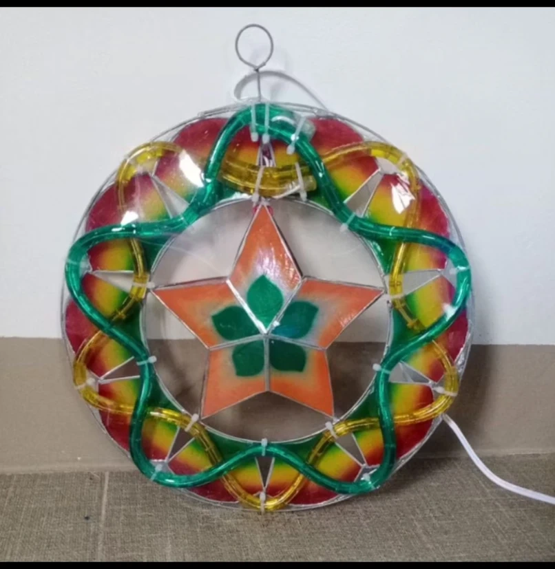 This is a festive Christmas parol lantern. It features a star design with colourful panels and LED lights. Great for holiday decorations!