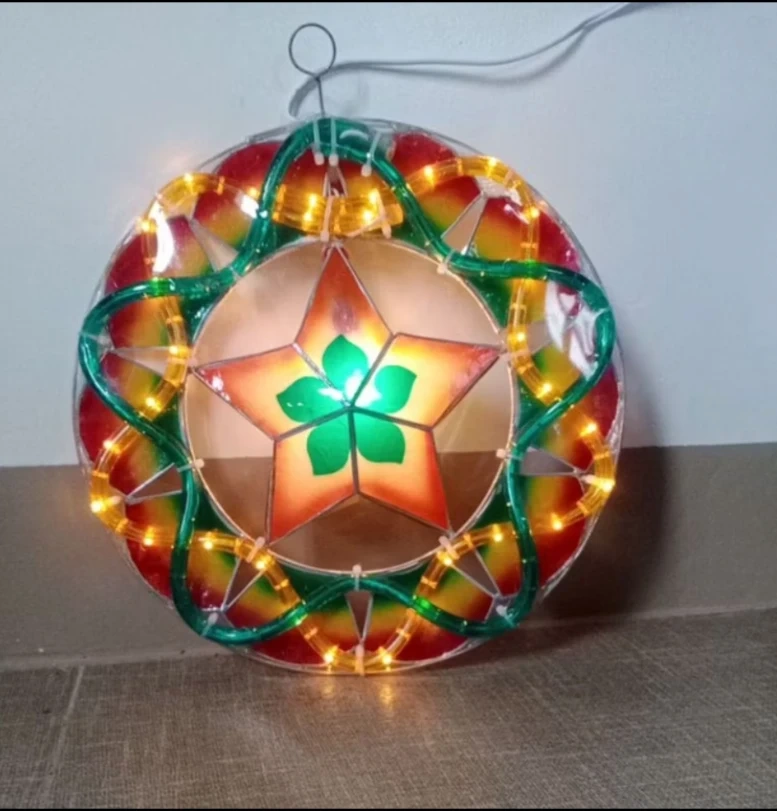 This is a festive Christmas parol lantern. It features a star design with colourful panels and LED lights. Great for holiday decorations!