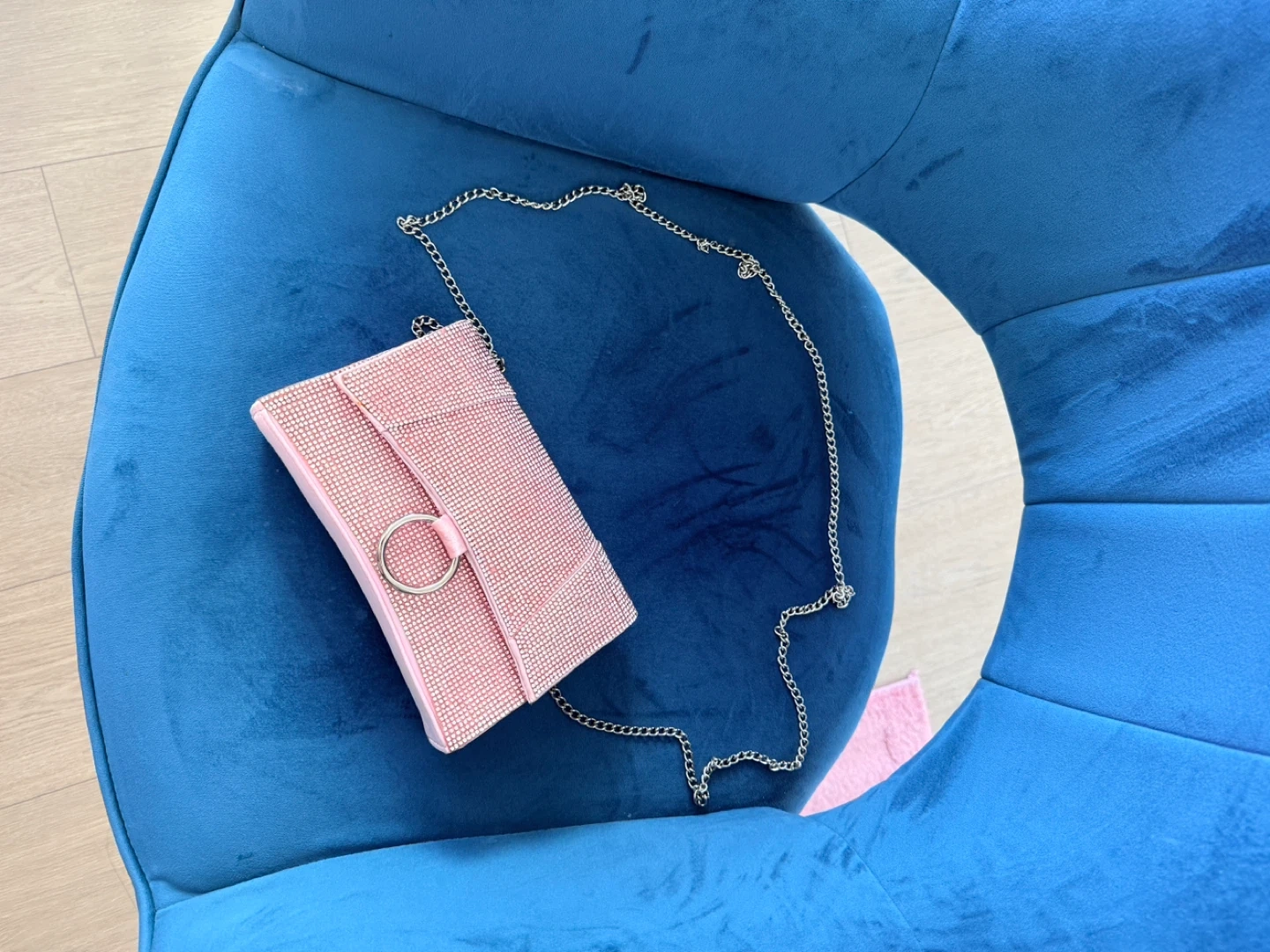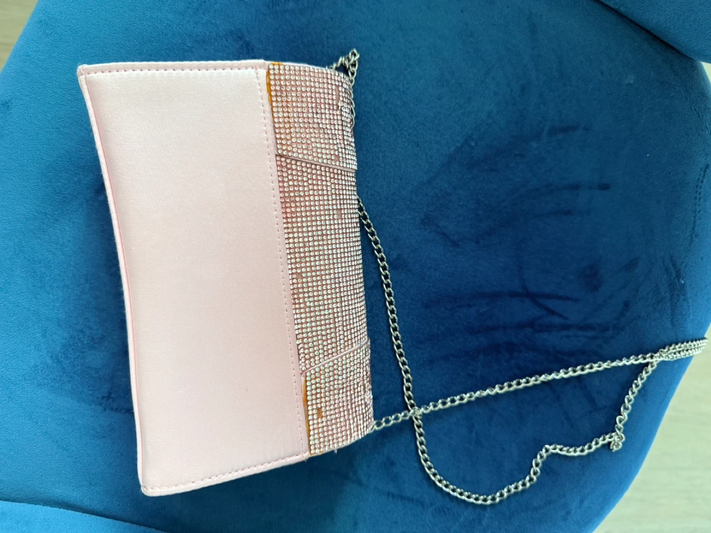 A stylish pink clutch purse adorned with sparkling rhinestones. It comes with a silver-tone chain strap for versatile wear. This bag is perfect for adding a touch of glam to your evening outfits!