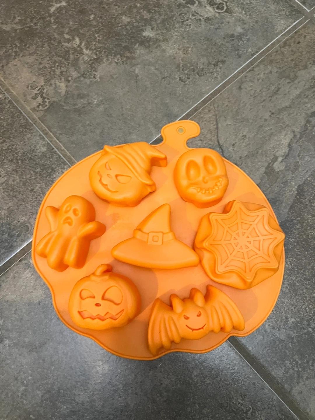 Get ready for some spooky baking with this fun Halloween-themed silicone mold! It's in the shape of a pumpkin and has different Halloween shapes like a ghost, bat, spiderweb, and jack-o'-lantern. Perfect for making cookies, candies, or even ice cubes for your Halloween party