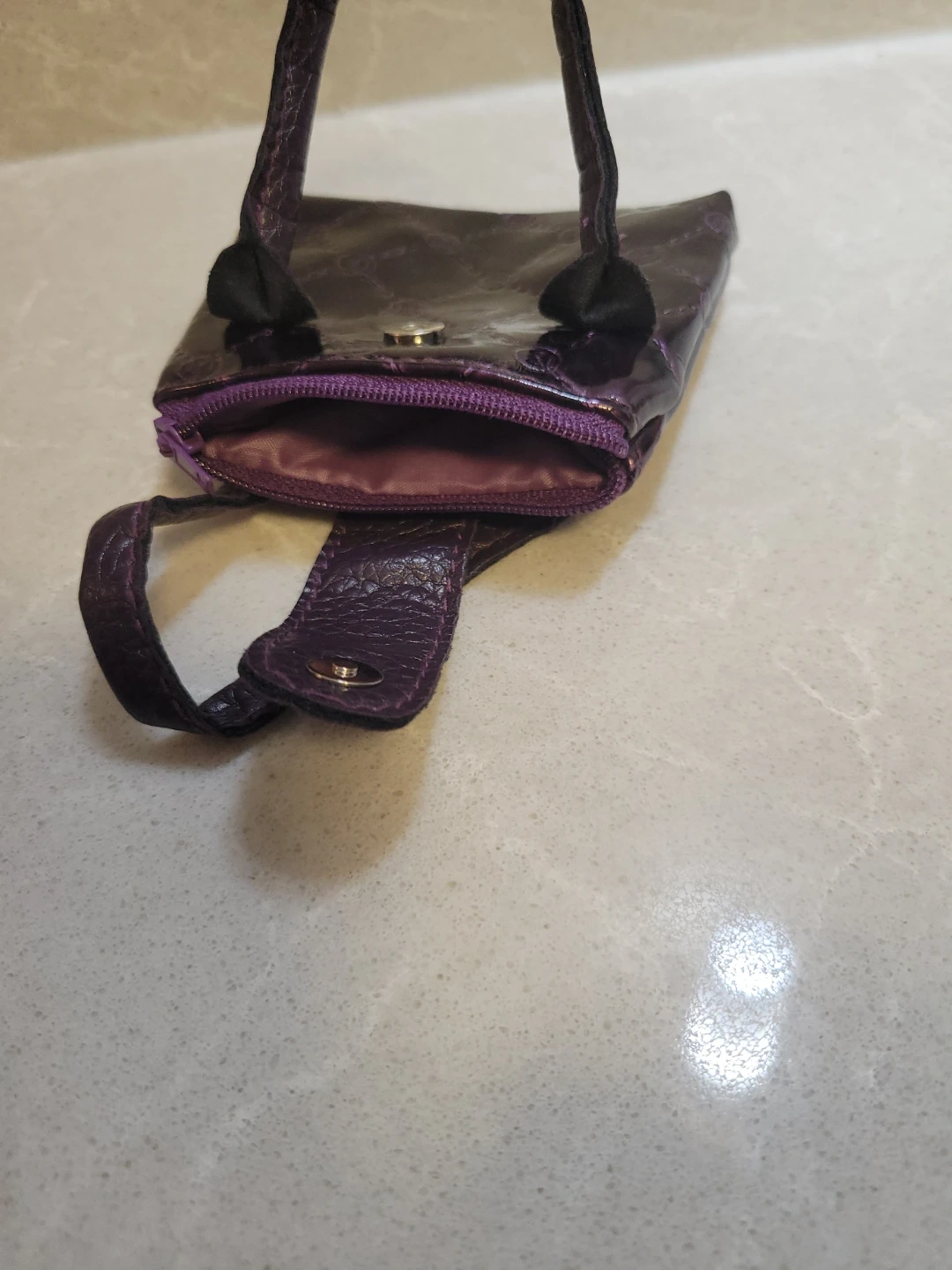 It features a top handle and a snap closure on the front flap. The interior is lined with purple satin.