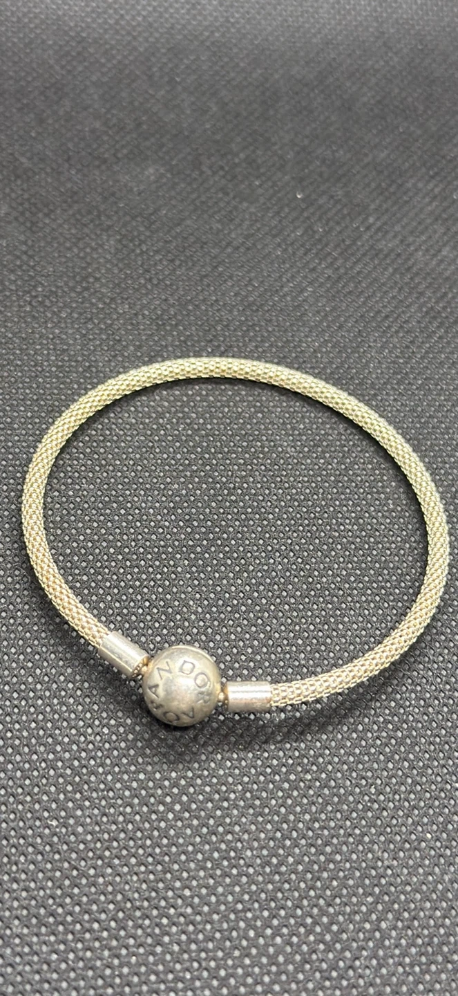 This is a Pandora sterling silver mesh bracelet. It features a branded clasp with "925 ALE" hallmarks. The mesh design gives it a unique texture.