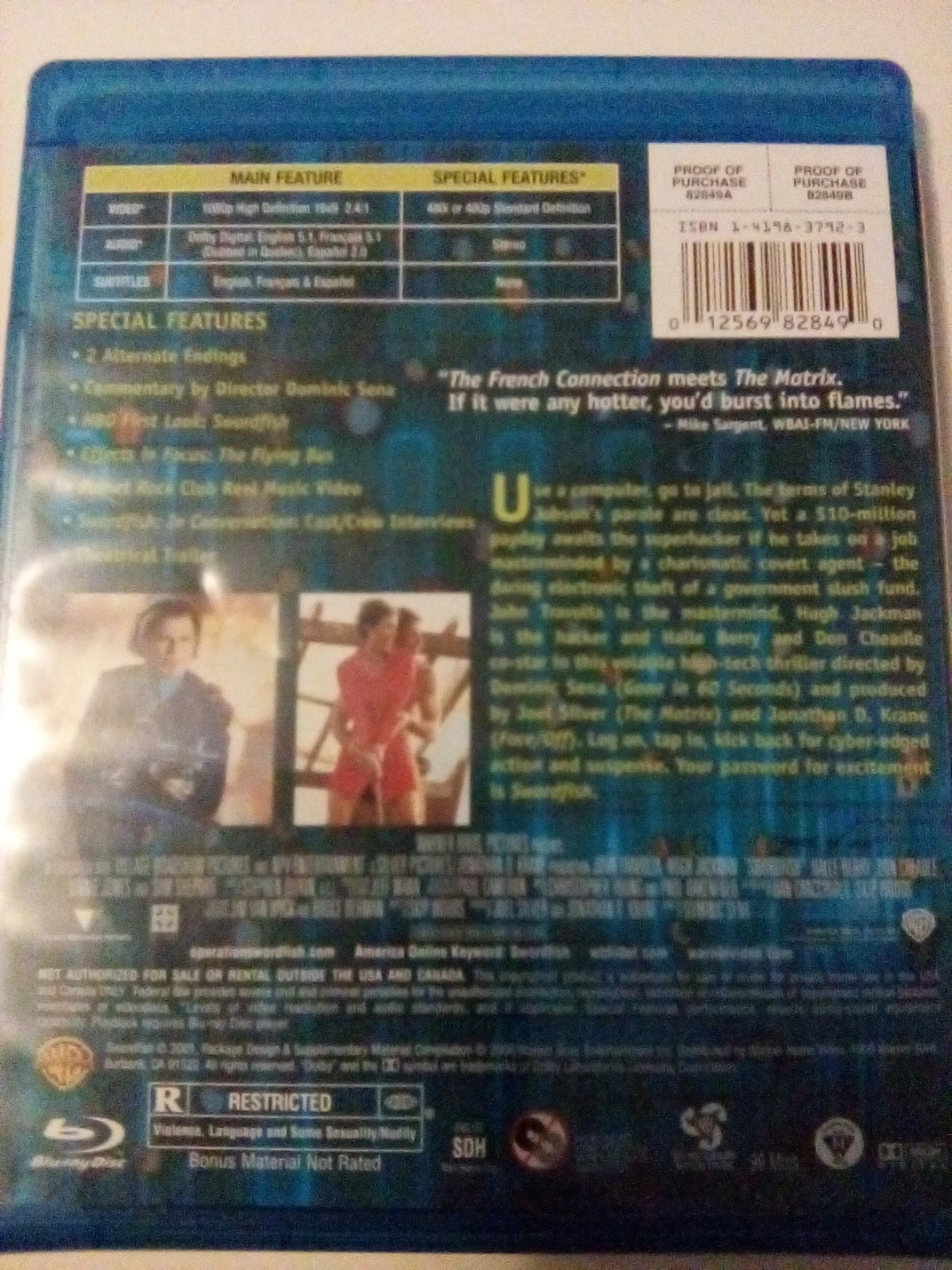 This is the Blu-ray edition of the action thriller Swordfish. It features high-definition video and digital surround sound. Includes special features like alternate endings and commentary.