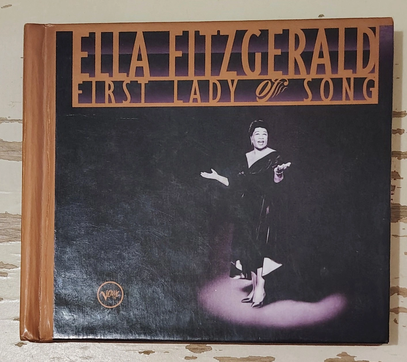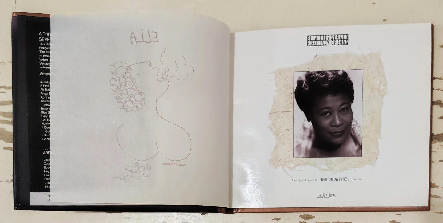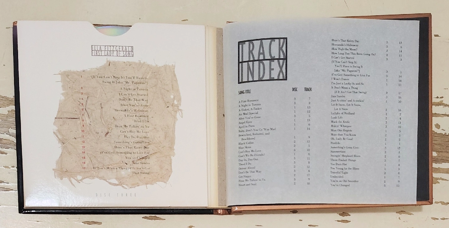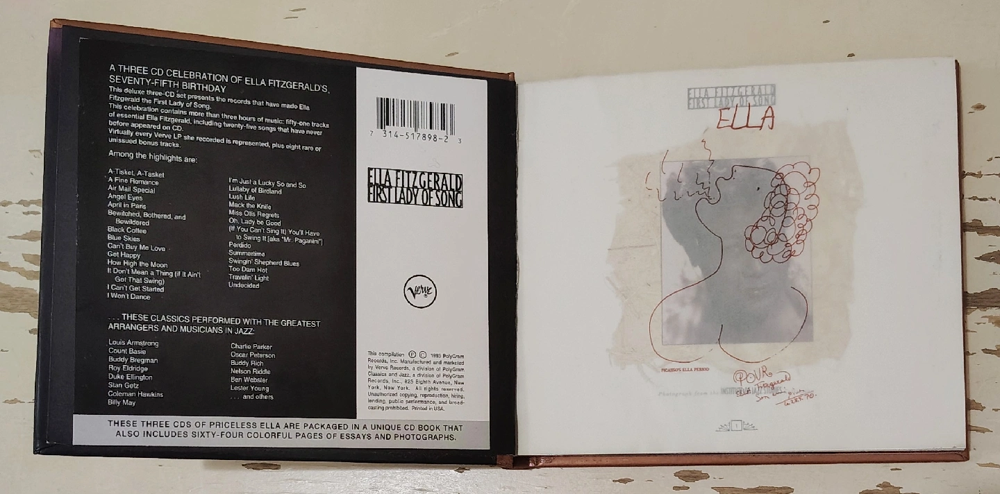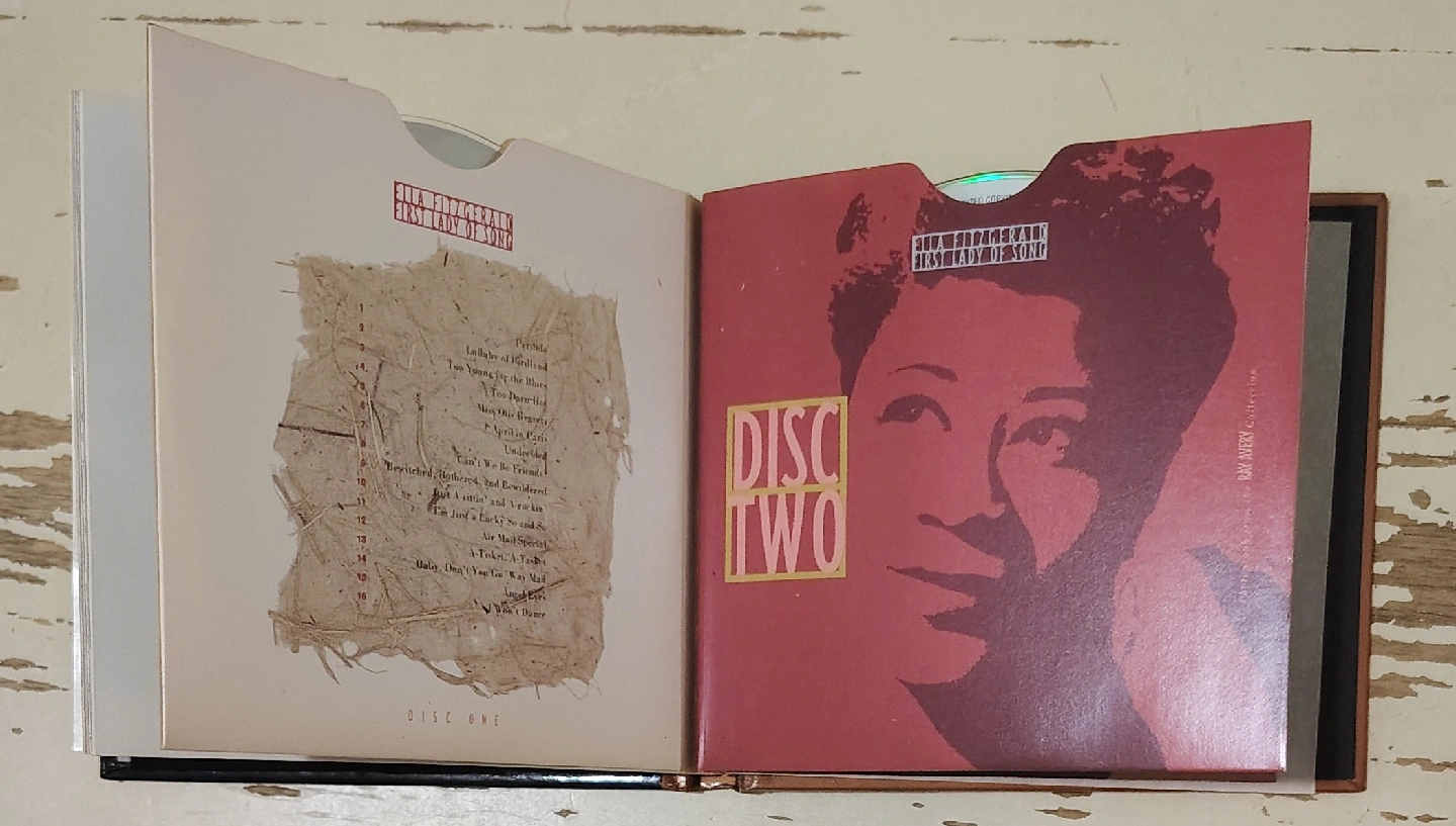 Ella Fitzgerald First Lady of Song CD box set. It's a three-CD celebration of Ella Fitzgerald's seventieth birthday. The CDs are packaged in a unique CD book that also includes sixty-four colorful pages of essays and photographs. This compilation is from 1993.