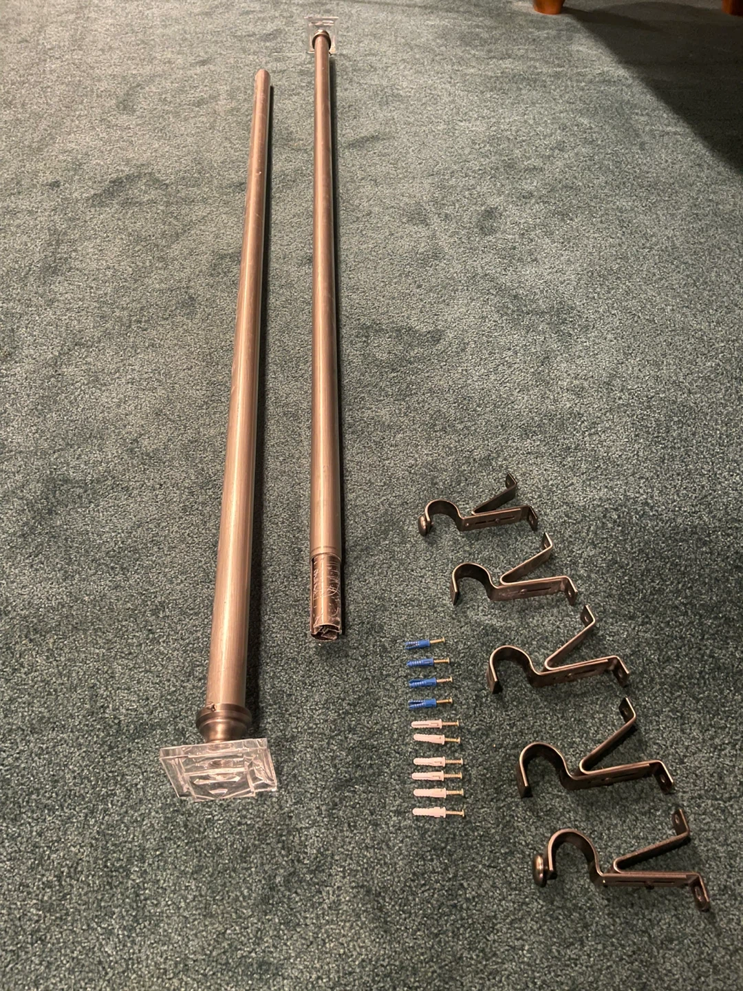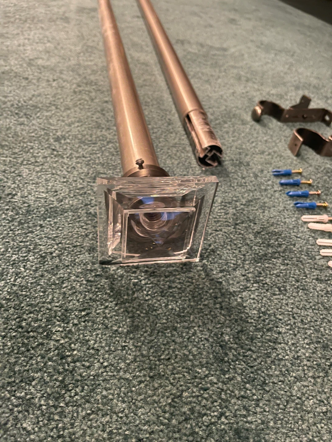 This curtain rod set includes ONE rod and multiple mounting brackets. It features a brushed nickel finish and decorative clear crystal finials. Includes screws and wall anchors for installation.