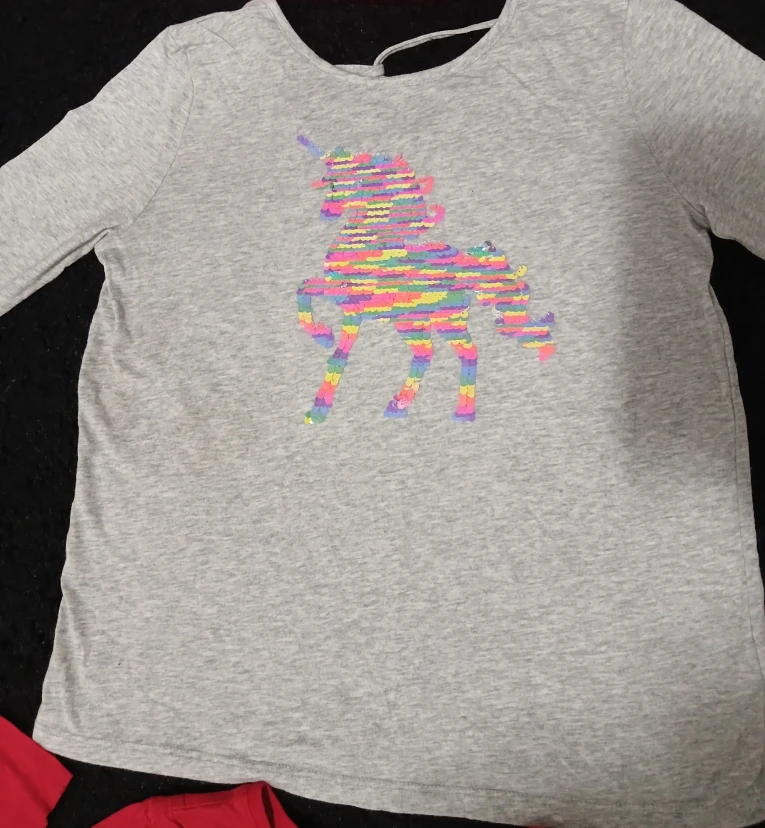 🌺Selling a bundle of girls' t-shirts, all Includes a cute design. Pink long sleeve athletic works shirt, a light pink Hello Kitty shirt, a grey unicorn shirt, and a red The Children's Place Christmas shirt. Great for everyday wear!