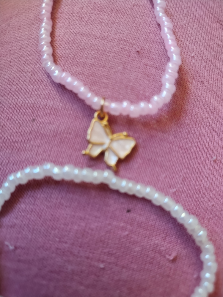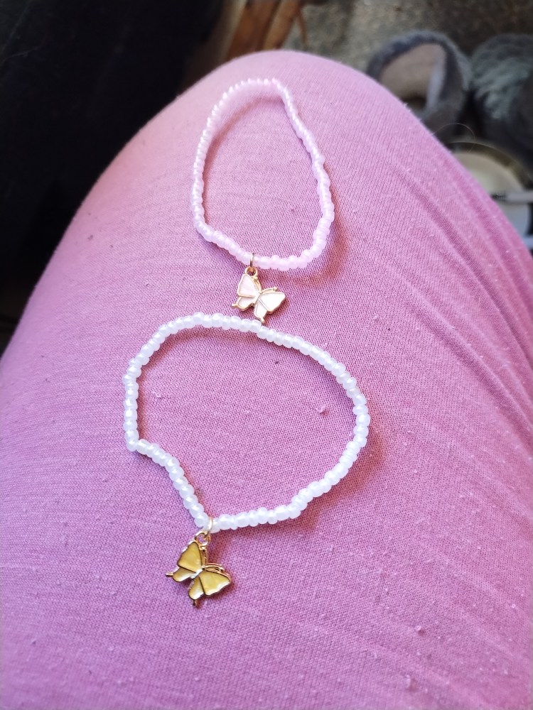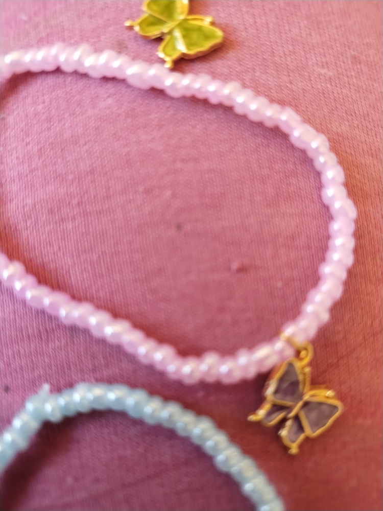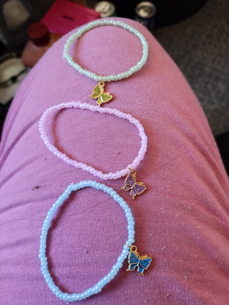 Selling a cute set of 5 beaded bracelets! Each bracelet has a unique butterfly charm in different colours: gold, green, purple , pink and blue. Perfect for adding a touch of whimsy to any outfit.