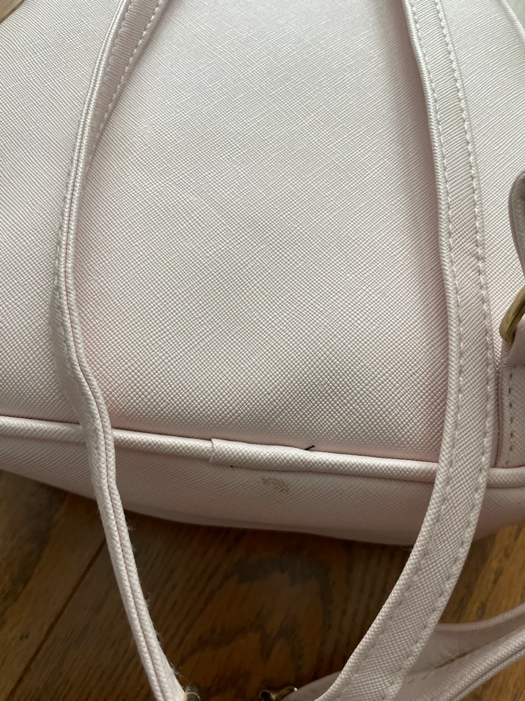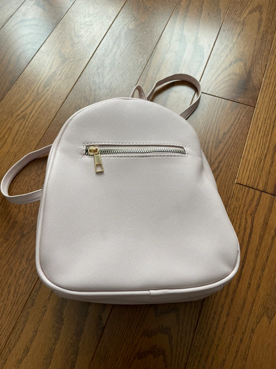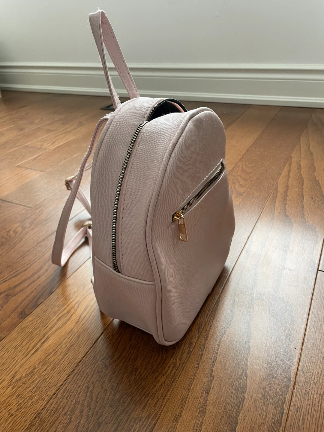 This is a light pink faux leather mini backpack. It has a zippered front pocket and adjustable shoulder straps. The material is textured.