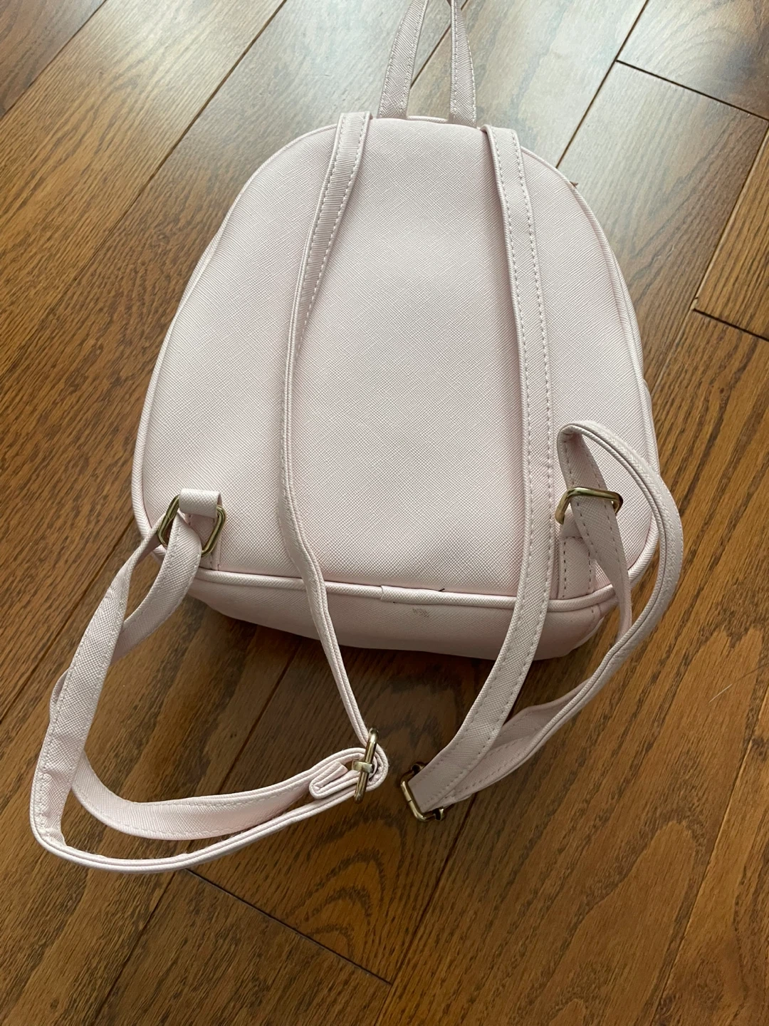 This is a light pink faux leather mini backpack. It has a zippered front pocket and adjustable shoulder straps. The material is textured.