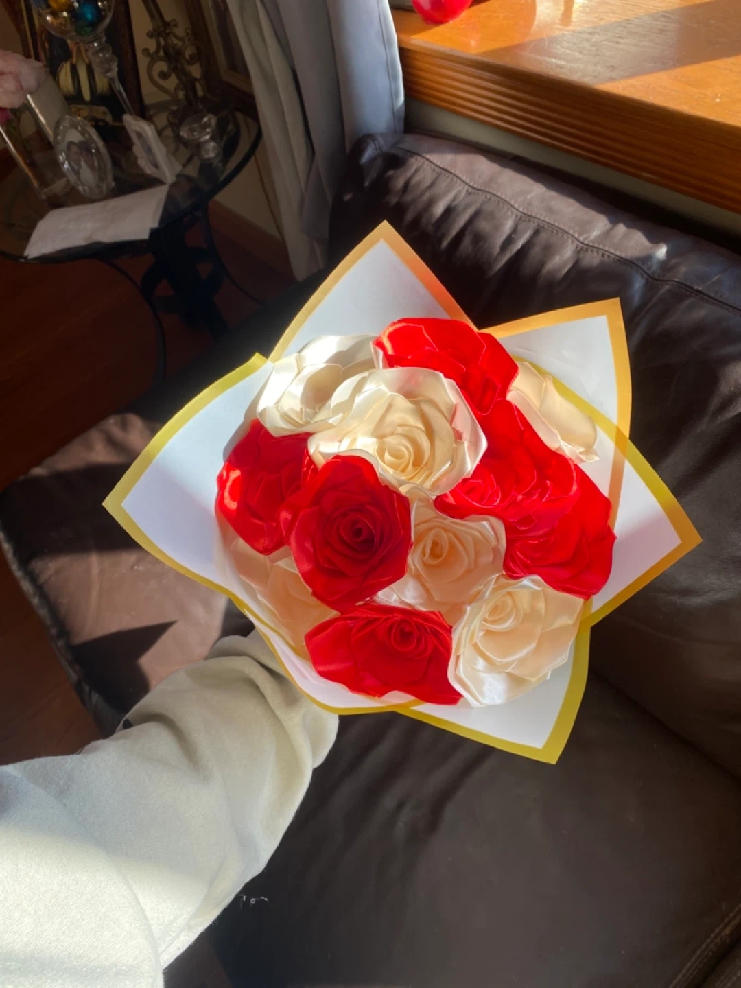A lovely bouquet made with faux roses in red and cream satin. These artificial flowers are arranged in a decorative paper wrap. It's a charming decoration that won't wilt!