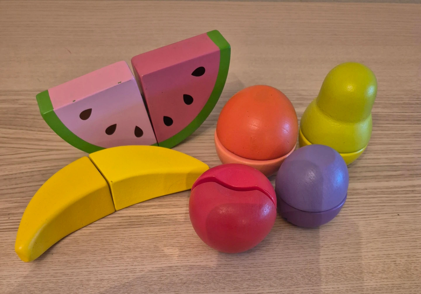 This set includes colourful wooden play fruits: a banana, a watermelon slice, an orange, a plum, and a pear. They're made of wood and painted brightly. Great for imaginative play! Fruit pieces are attached by velcro to practice cutting.