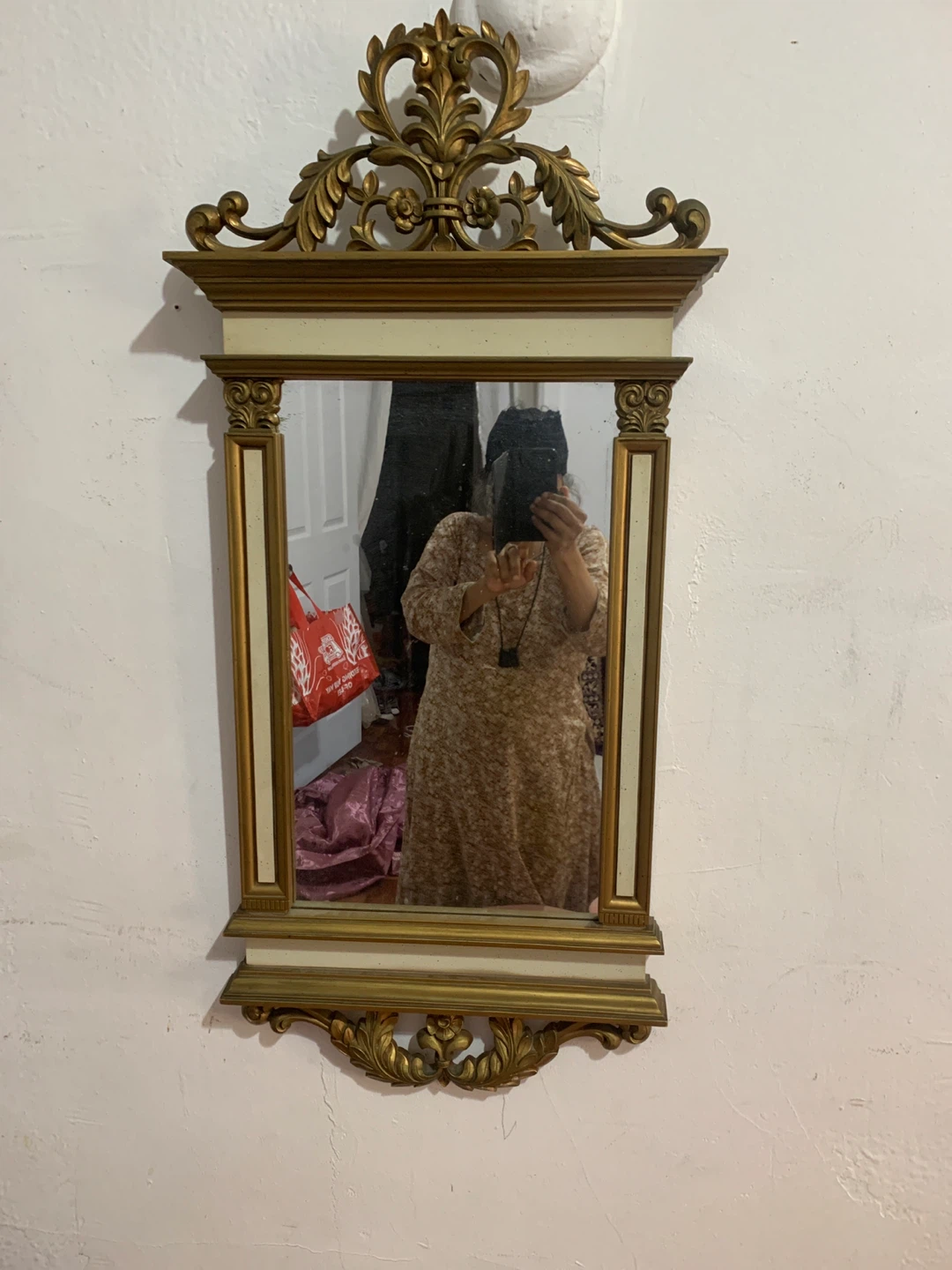 This is a decorative wall mirror with an ornate gold frame. It's designed to add a touch of elegance to any room. The frame is gold-tone with intricate detailing.