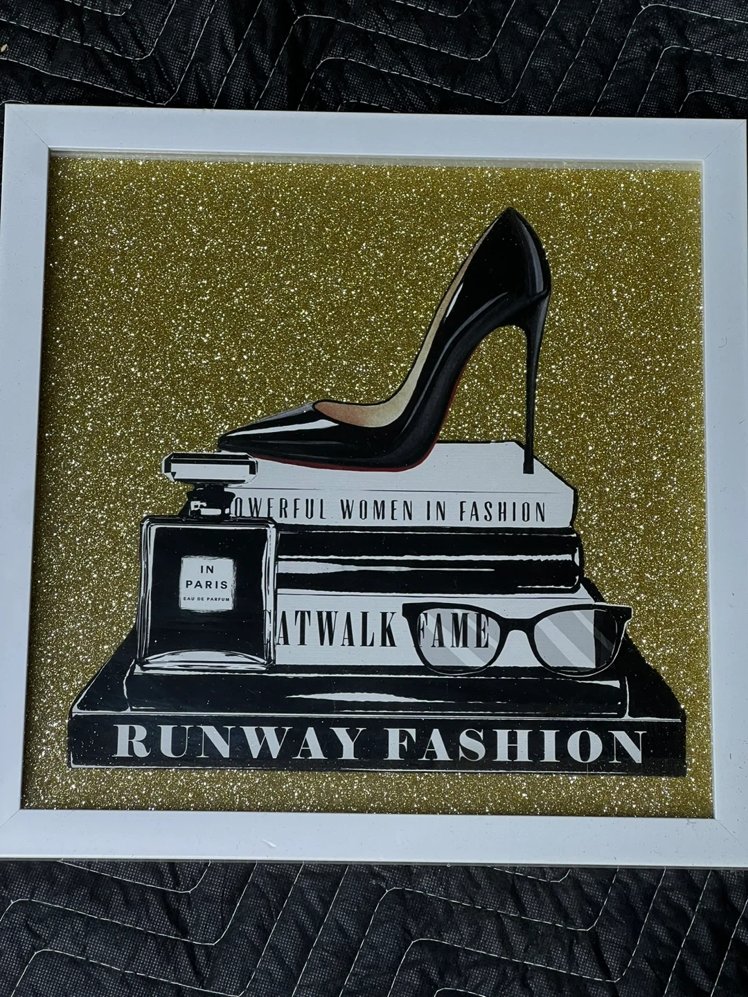 This framed wall art features a chic design with a high heel shoe, books, and perfume bottle. The background is covered in shimmering gold glitter. It's ready to add a touch of glamour to any room!