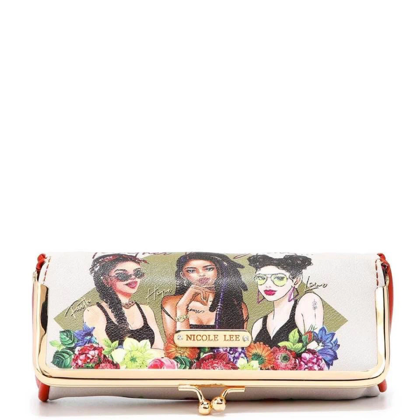 This is a Nicole Lee kisslock clutch wallet, featuring a unique design with a floral and portrait pattern. It's perfect for adding a touch of style to your outfit!