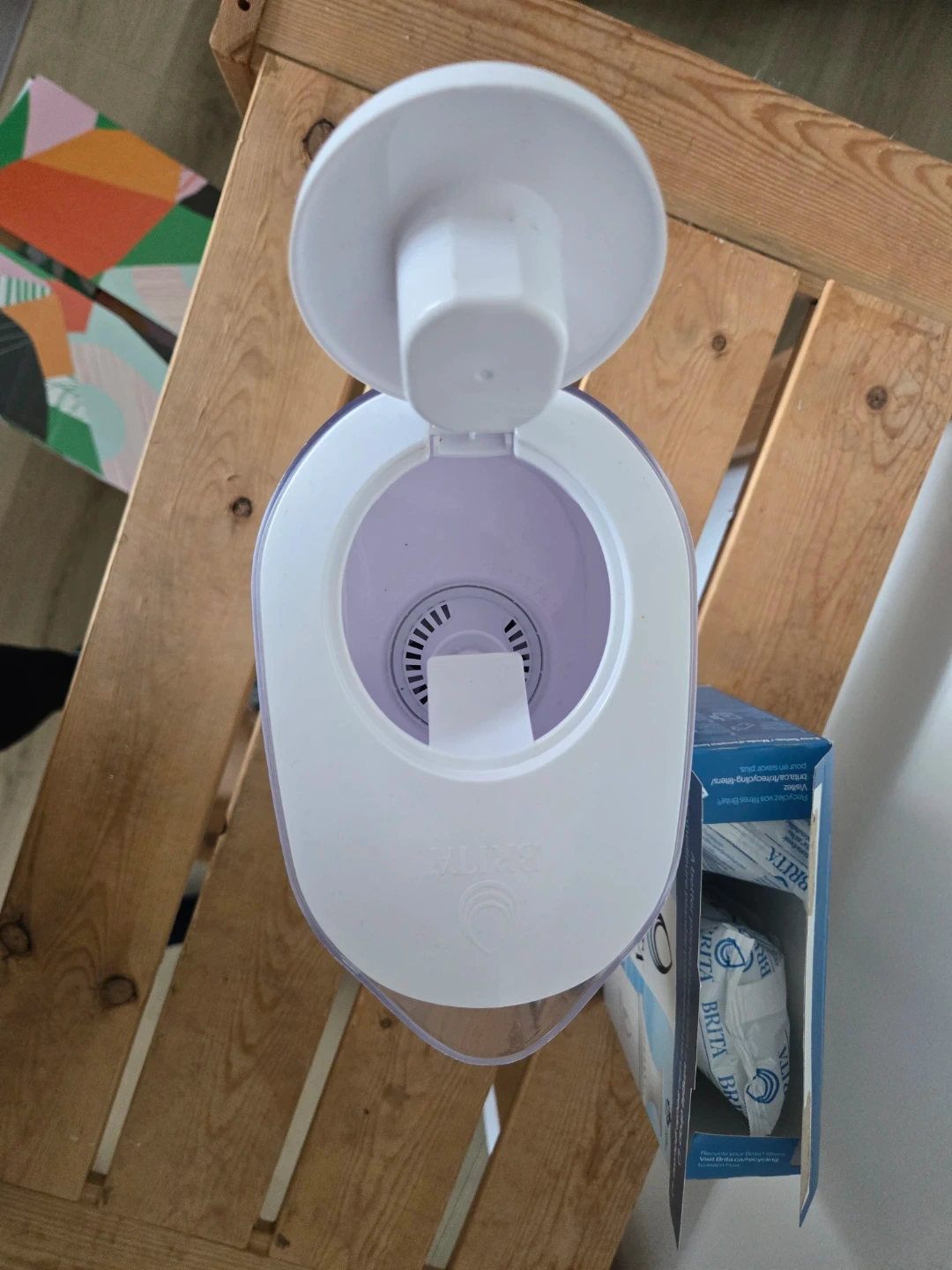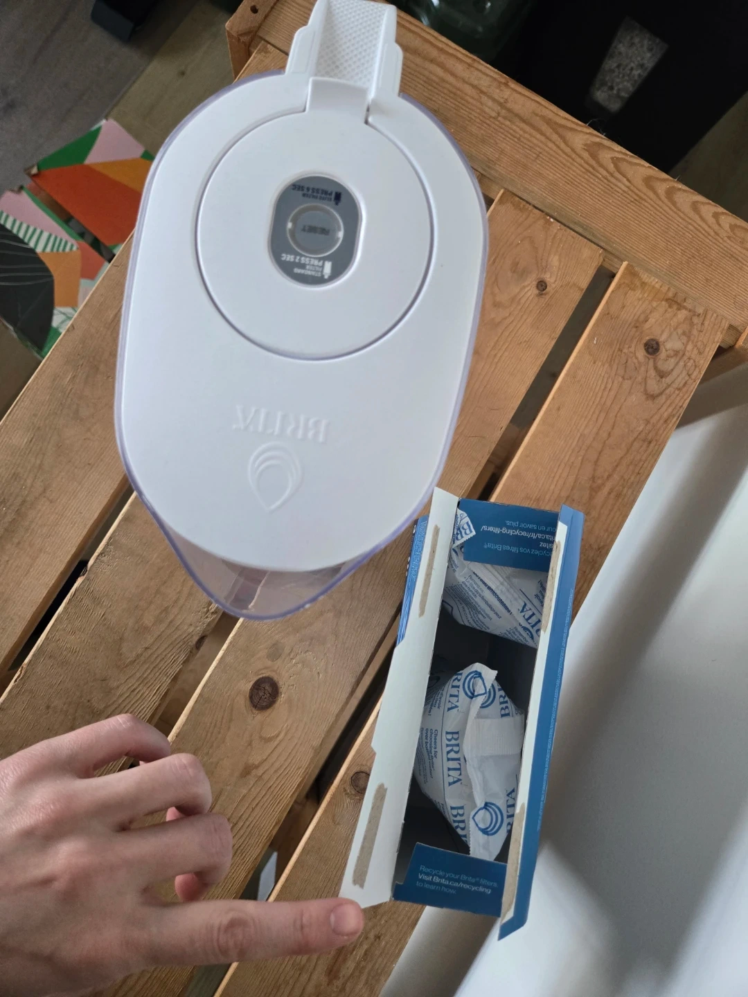 Brita water filter pitcher with one filter in it (used a few times only) and two replacements included. It's white and clear plastic. This pitcher helps reduce contaminants in your drinking water.